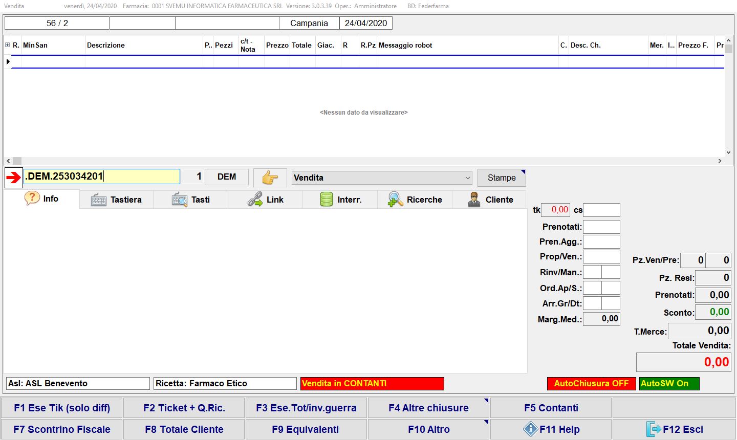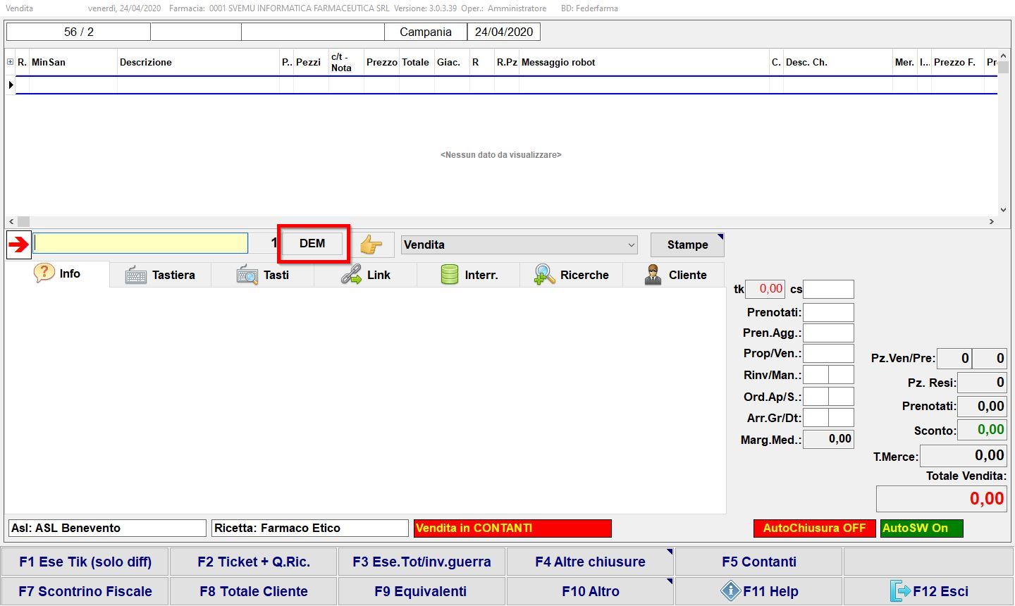 Accedi in F1 Vendita quindi premi il tasto DEM posizionato accanto al campo inserimento: