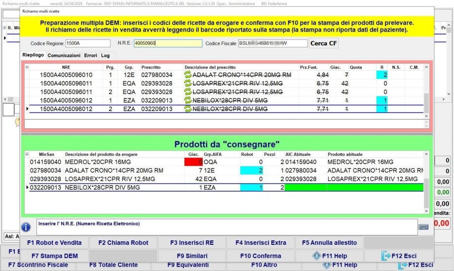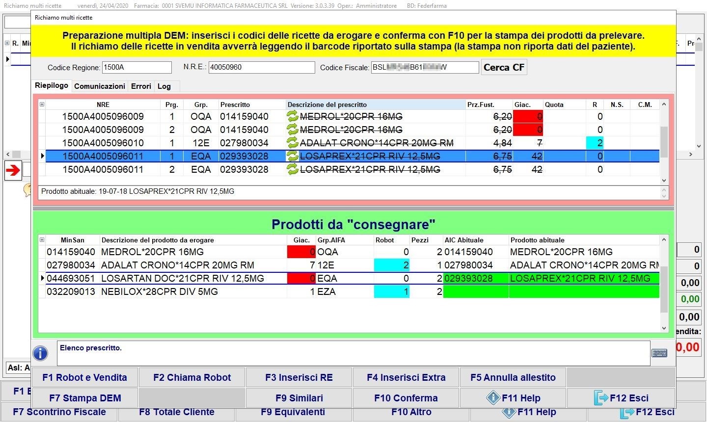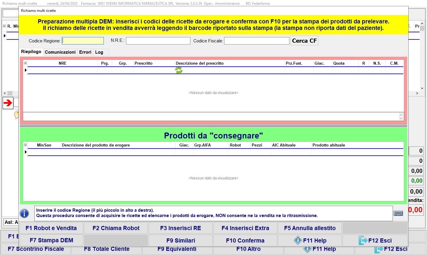 • Se hai necessità di stampare i promemoria devi farlo prima di chiamare i prodotti tramite Robot, ovvero inserisci anzitutto tutte le ricette e definisci i prodotti da erogare, poi premi F7 Stampa DEM (si creerà un file pdf delle ricette che potrai stampare) e solo successivamente F2 Chiama Robot.