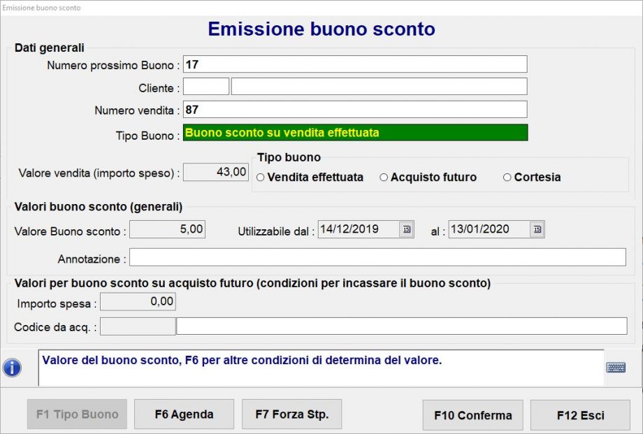 In vendita procedi come di consueto (leggi qui), ad operazioni ultimate chiudi con e se richiesto digita o seleziona il Codice fiscale dall’elenco quindi conferma con , oppure chiudi con per emettere lo “Scontrino non Fiscale”, sarà emesso in questa fase anche il buono sconto.