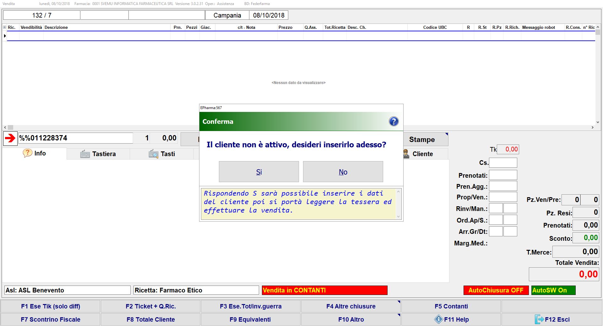 - Con l’ausilio del lettore ottico inserisci il barcode della tessera del cliente, se il cliente collegato a quel numero di tessera non è attivo è possibile abilitarlo rispondendo Sì alla richiesta di conferma che visualizzerai a video.