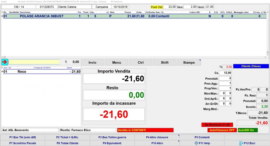- Passa in vendita il prodotto che ti è stato reso e procedi poi con la chiusura della stessa. Visualizzerai il riepilogo della procedura di reso nonché il saldo punti SPEM aggiornato: