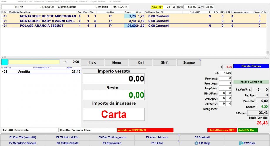 - Inserisci come di consueto il/i prodotto/i parafarmaceutico/i in vendita e poi chiudi la stessa con (se richiesto digita o seleziona il Codice fiscale dall’elenco e conferma con ), oppure con per emettere lo “Scontrino non Fiscale”. A vendita chiusa visualizzerai la seguente schermata di riepilogo con indicato anche il saldo punti del circuito aggiornato.