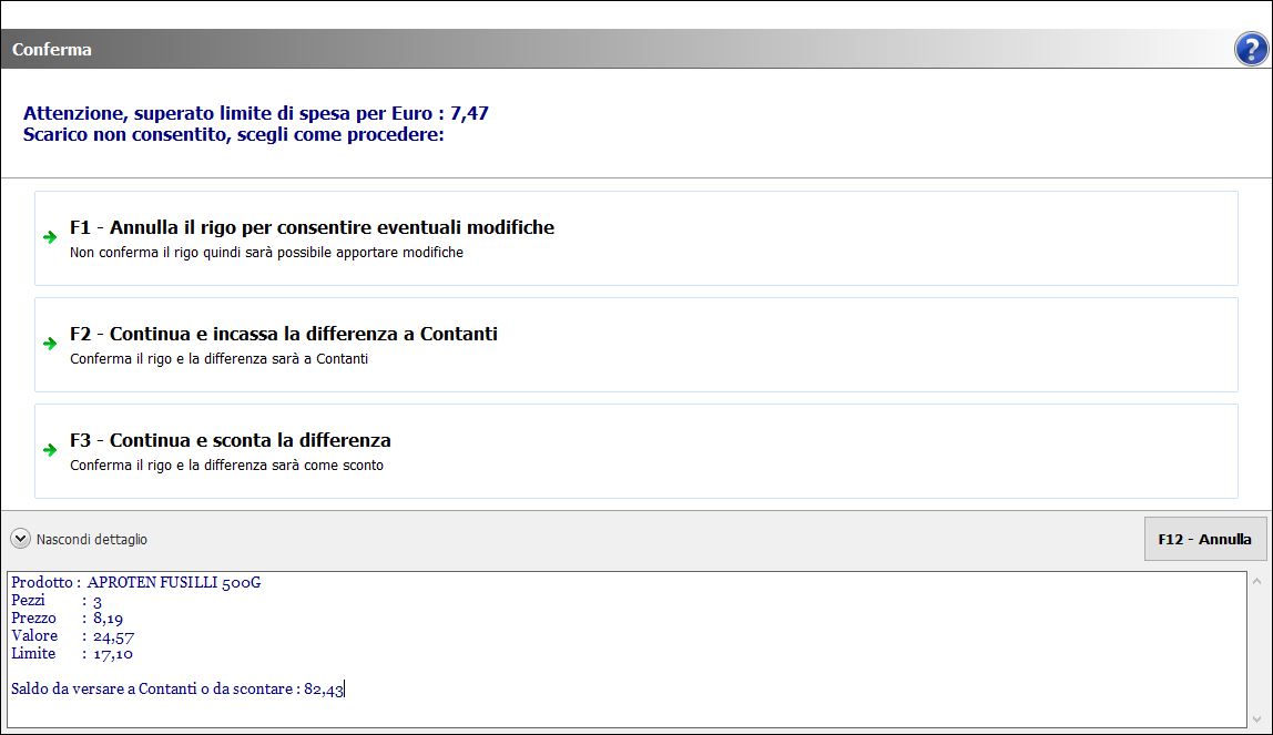 Qualora durante la vendita di prodotti senza glutine il totale vendita superi il valore del buono spendibile, la procedura ti avviserà chiedendo di scegliere come procedere:Superato limite di spesa Celiachia