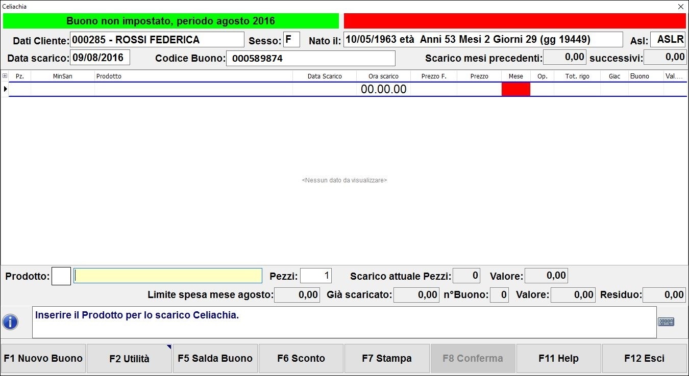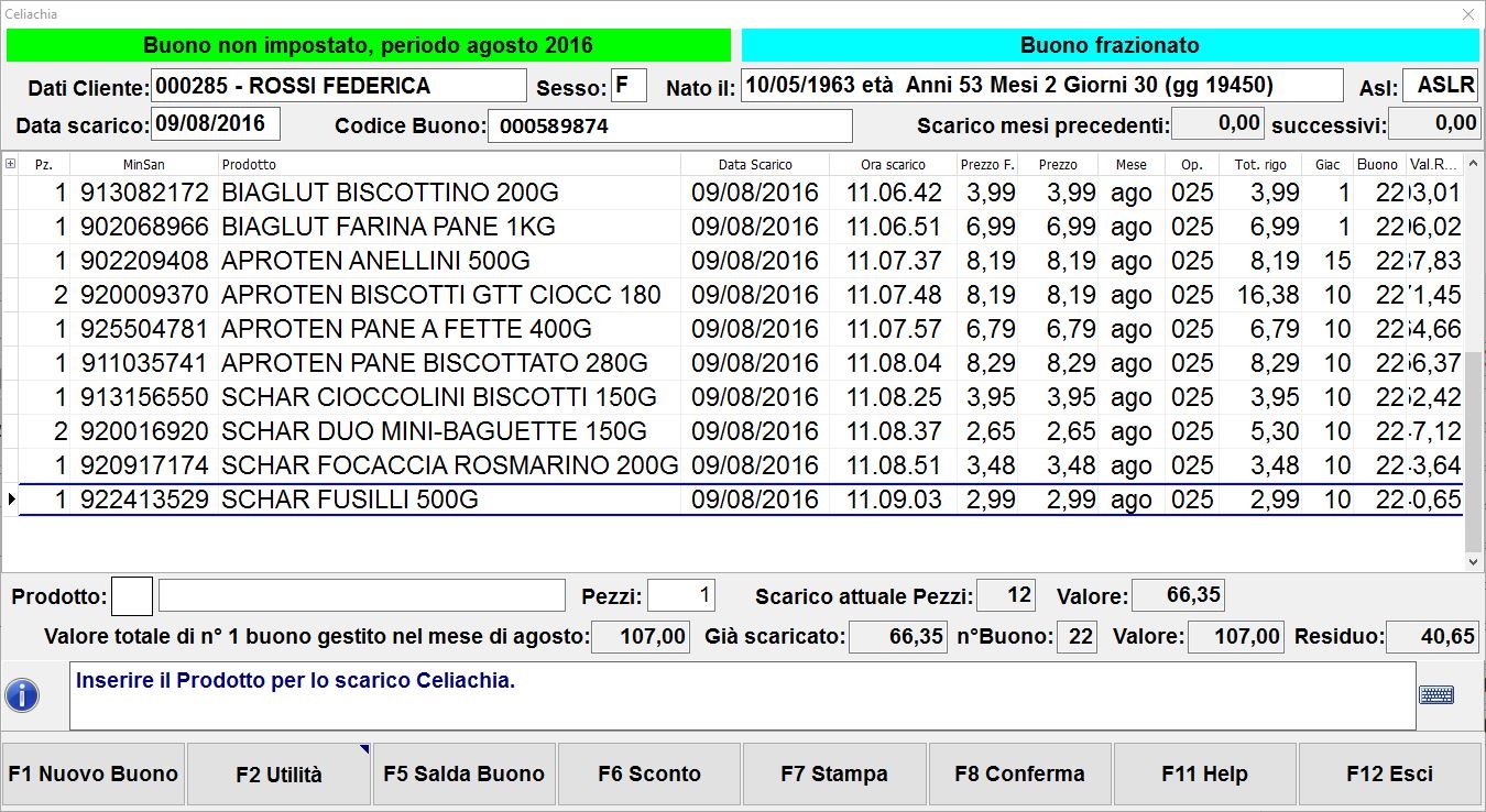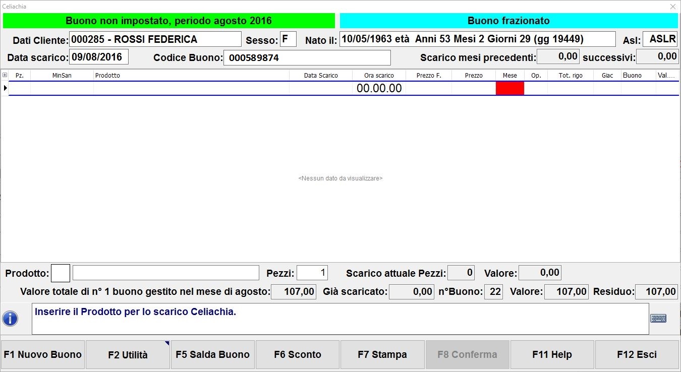 5. Inserisci quindi il numero del buono ed il suo valore negli appositi campi che visualizzerai in successione e conferma i valori inseriti con F10 Conferma. La finestra del contesto Celiachia risulterà così aggiornata: