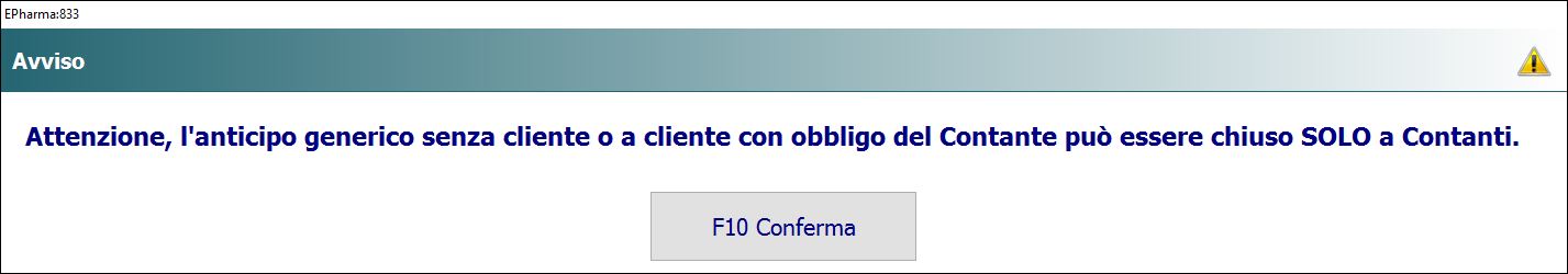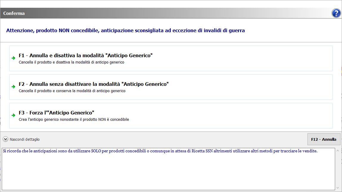 - Premi per cancellare e disattivare la modalità di anticipo inserita per eventuali aggiunte di prodotti non di fascia A, oppure premi per cancellare solo quest’ultimo prodotto inserito e proseguire con l’anticipo di altri prodotti di fascia A, oppure per inserire nell’anticipo anche un prodotto non concedibile in regime SSN (da vendere sempre e comunque a contanti).