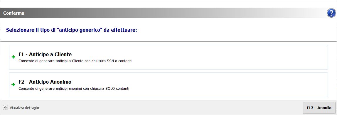 La gestione dell’anticipo generico richiede obbligatoriamente che venga gestito il Conto cliente, anche se limitatamente agli anticipi generici (Tipo Conto = A).