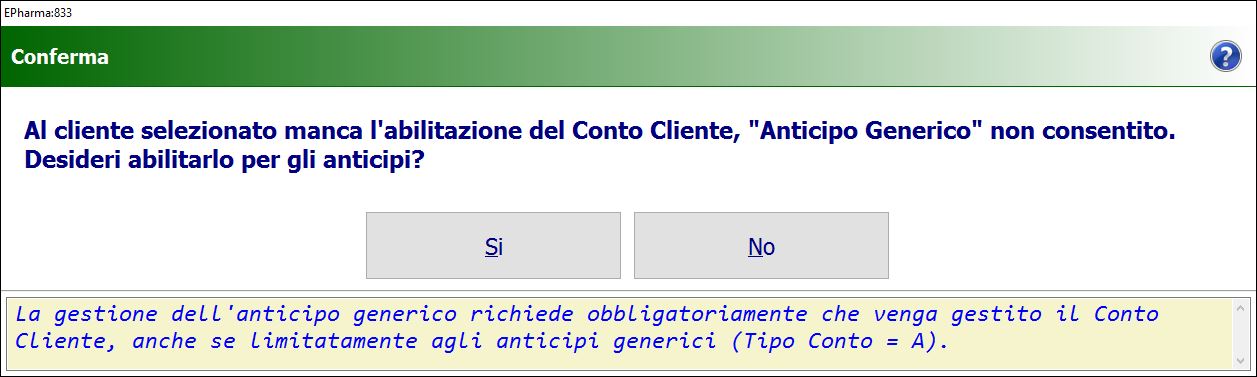 - Se per il cliente selezionato non è abilitato il Conto cliente visualizzerai un avviso di richiesta conferma di attivazione, quindi premi Si per procedere all’abilitazione automatica.