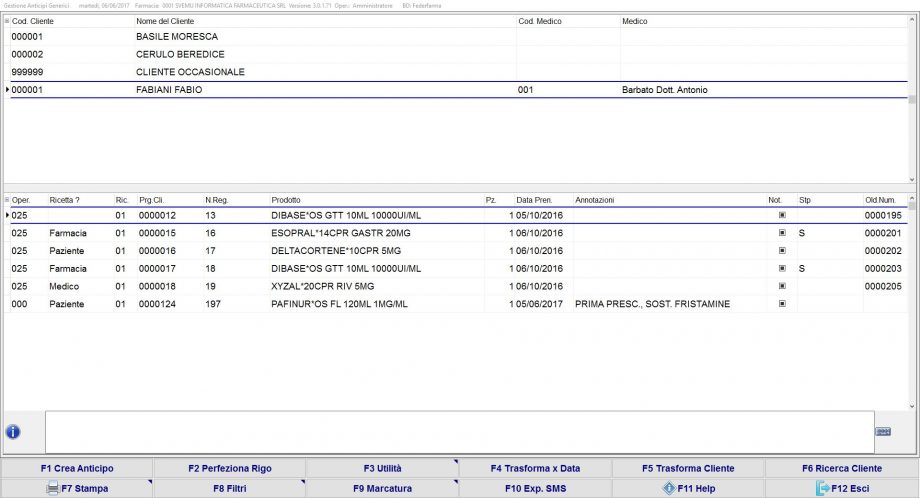 Con questo tipo di gestione è possibile stabilire, in fase di creazione dell’anticipo a Cliente nominativo, chi dovrà farsi carico di far redigere e stampare dal Medico di Medicina generale le ricette riferite ai prodotti in quel momento anticipati.