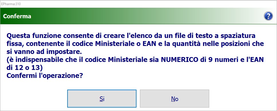 - Dopo aver aperto il file txt visualizzerai la seguente schermata all’interno della quale devi impostare la posizione iniziale e la lunghezza dei codici Minsan (importando un file txt formato da un codice Minsan di 9 caratteri devi lasciare i valori come visualizzati di default). Conferma l’operazione con .