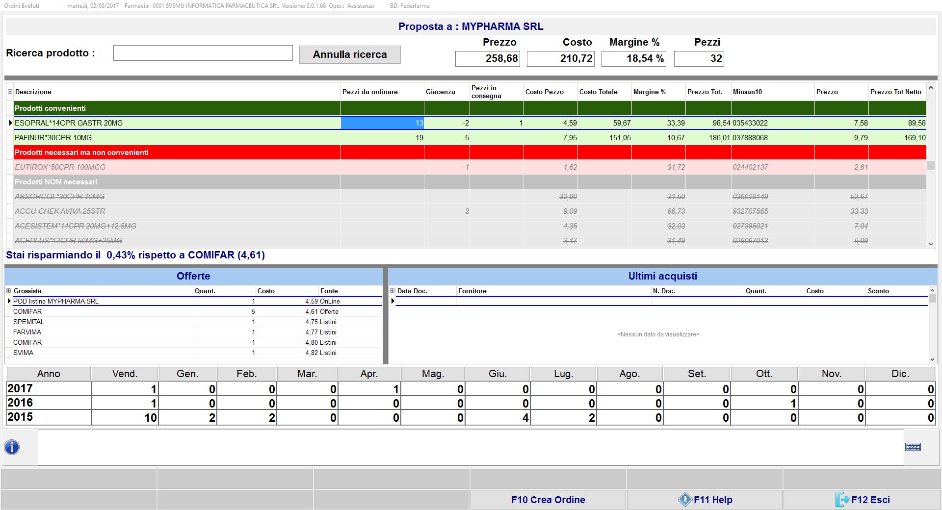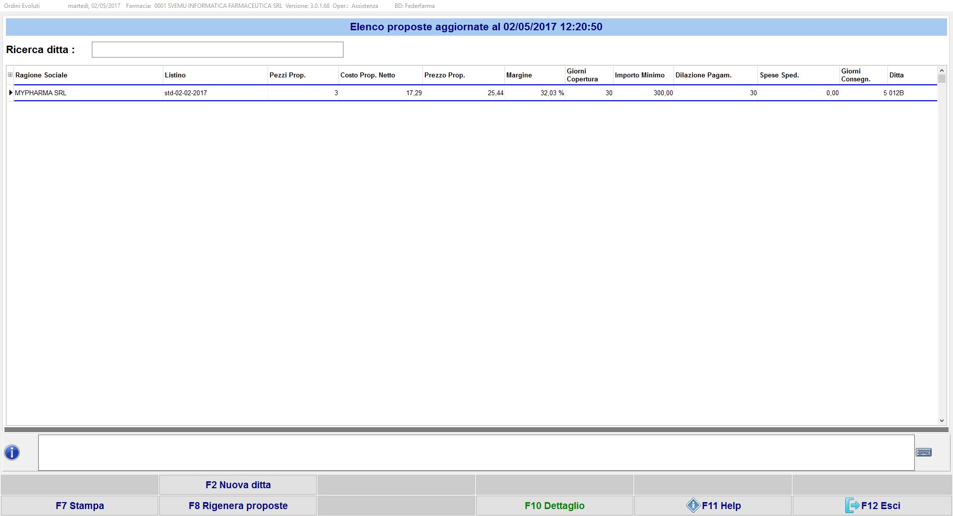 2. Nel contesto Ordini Evoluti nel quale entrerai premi F2 Nuova ditta ed attendi l’elaborazione della proposta. A questo punto visualizzerai un elenco di proposte aggiornate ed il relativo listino MYPHARMA SRL (con le relative specifiche) attraverso il quale generare il tuo ordine.