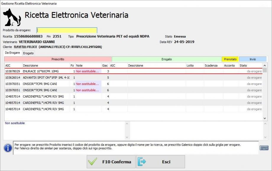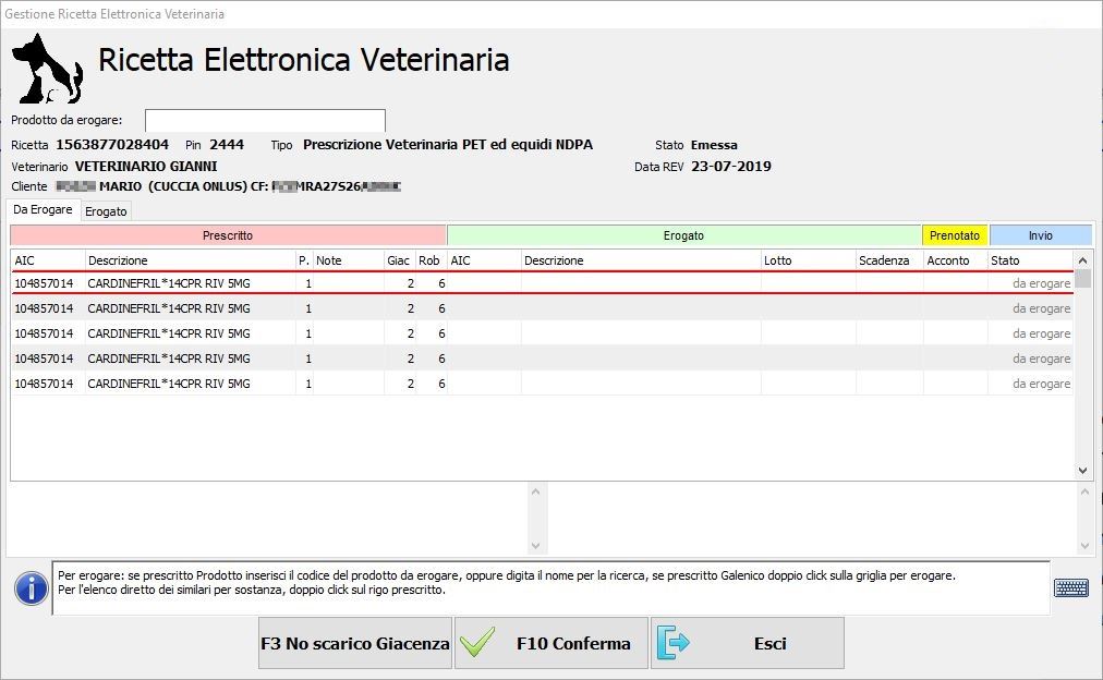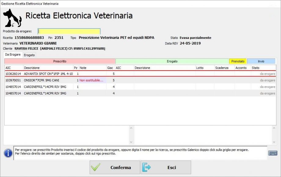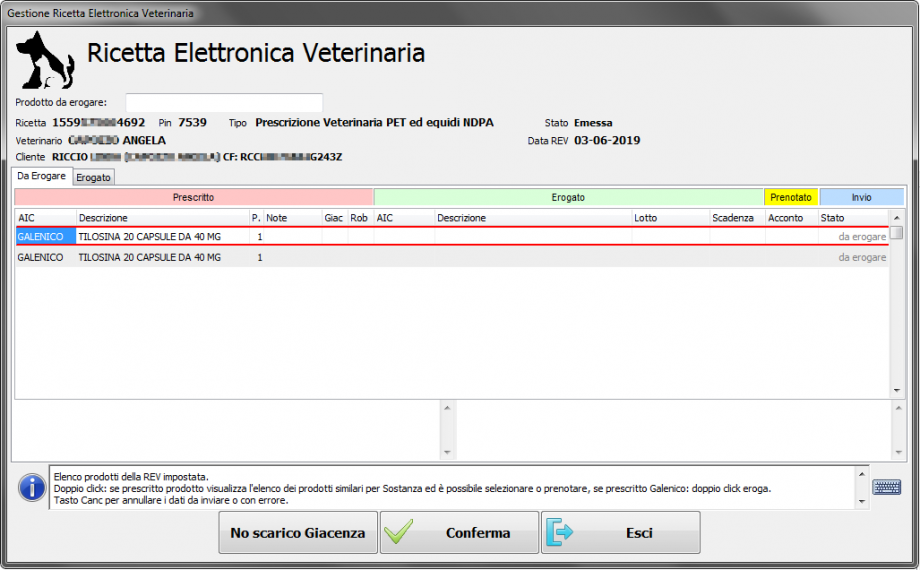 - Se hai accettato di gestire la ricetta elettronica veterinaria per procedere con le operazioni di spedizione inserisci il PIN che ti è stato fornito e premi . A video visualizzerai il/ prodotto/i prescritto/i dal Medico veterinario.