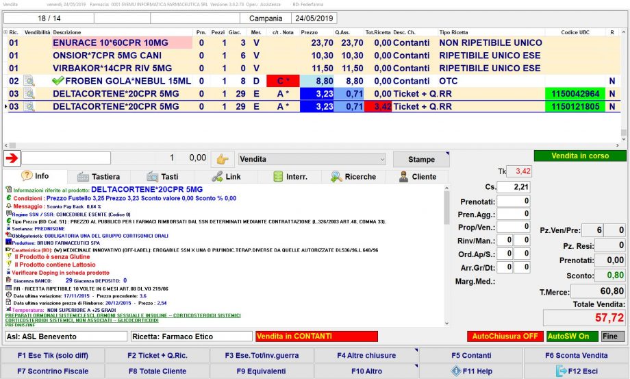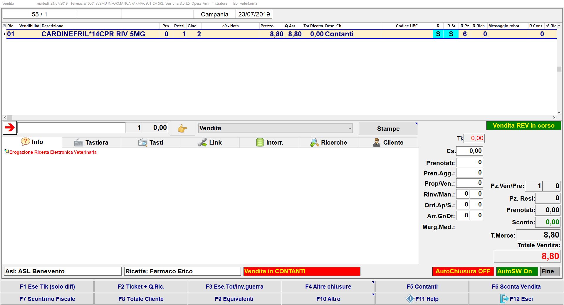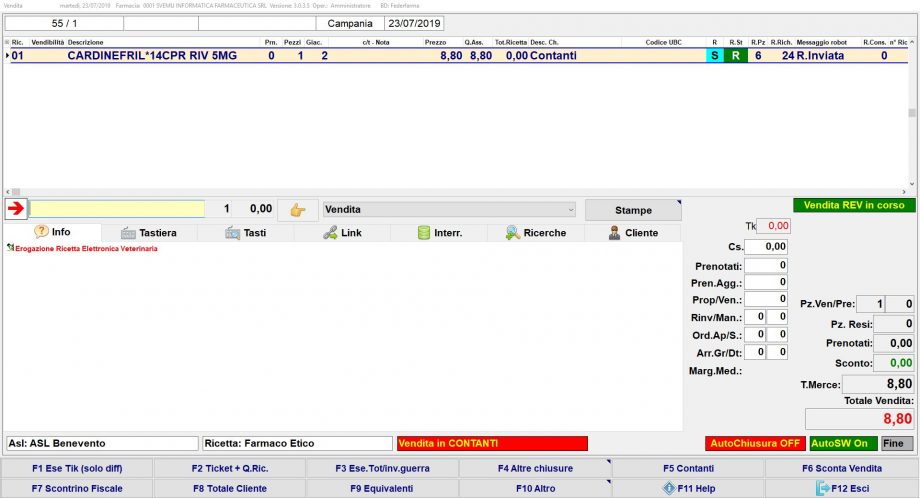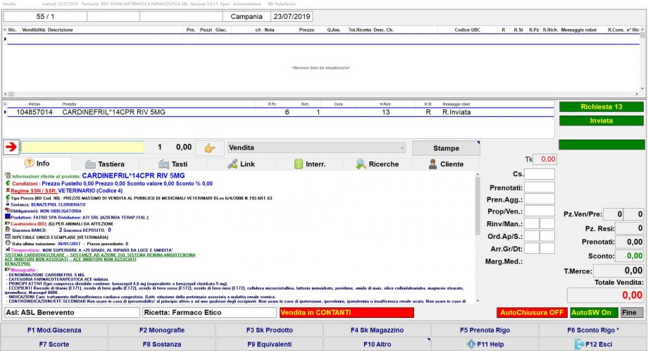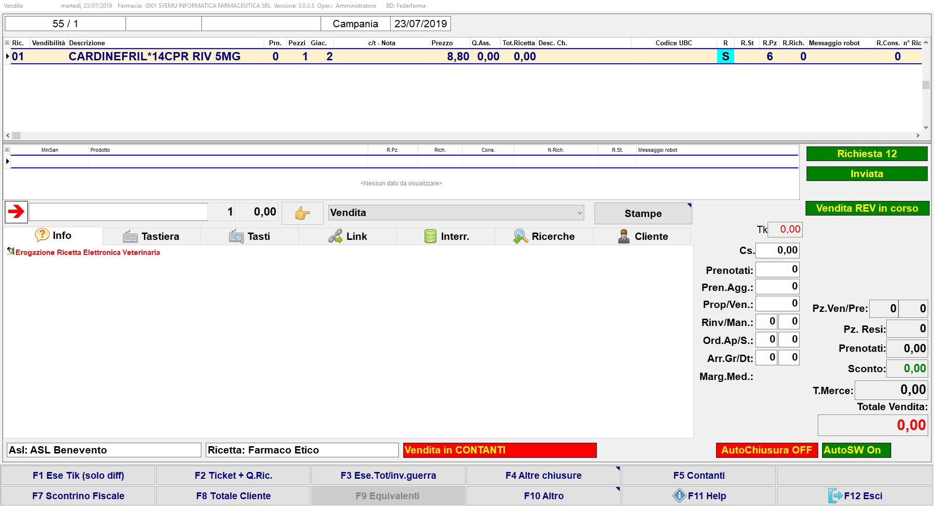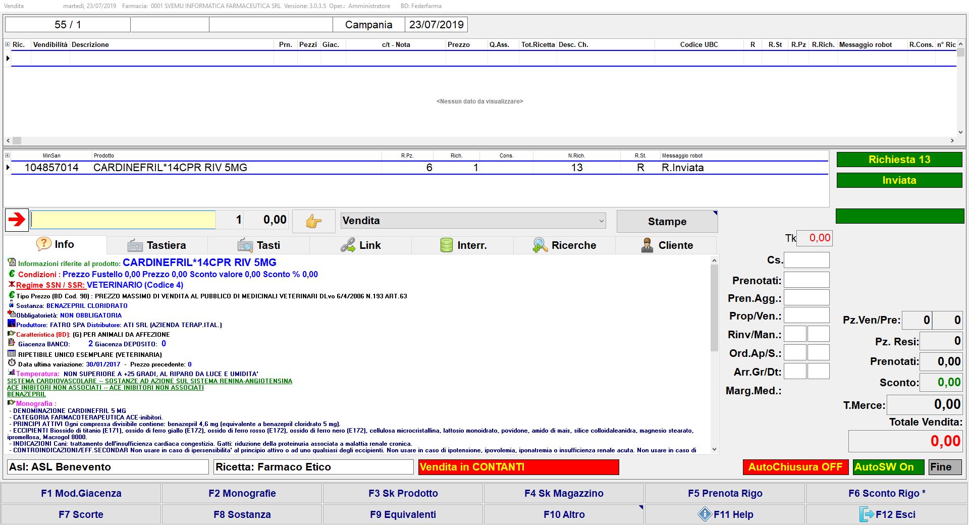 - Fatto ciò premi il tasto e attendi l’invio e l’elaborazione dei dati al Ministero, sarai rimandato nella schermata di vendita del gestionale (solo in questa fase avverrà lo scarico delle giacenze) che ti consentirà di concludere l’erogazione dei prodotti veterinari o di aggiungere alla stessa vendita altri prodotti o ricette.