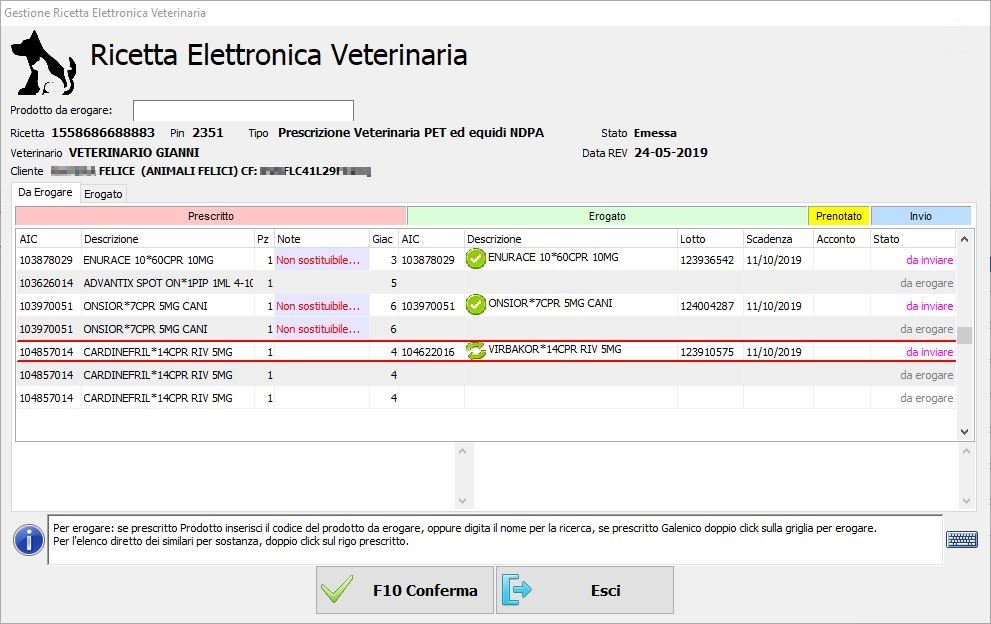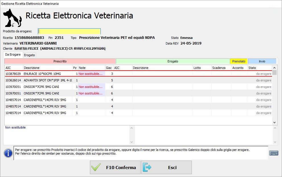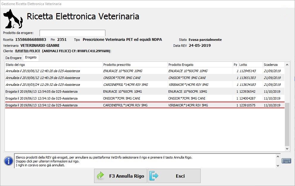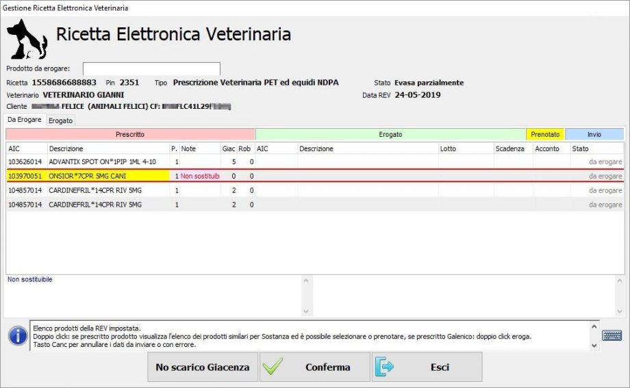 - La R.E.V. può anche essere evasa parzialmente, ma per essa non è possibile prendere in carico la ricetta per le erogazioni successive (quindi i prodotti possono essere acquistati anche presso altre Farmacie/Parafarmacie ecc.). Quando il paziente si ripresenterà in Farmacia per una erogazione successiva, sarà possibile evincere ciò sia verificando lo stato della ricetta sia visualizzando i prodotti non ancora erogati (pagina Da Erogare):