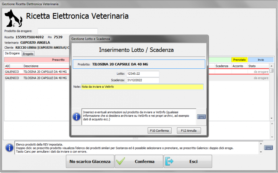 In questo caso devi fare doppio click sul prodotto da erogare per procedere con la spedizione, poi premi ed inserisci il costo della preparazione che hai precedentemente calcolato e la relativa aliquota IVA. Infine inserisci Lotto e Scadenza e nel campo Note quanto ritieni opportuno di inviare per quel prodotto a VetInfo.