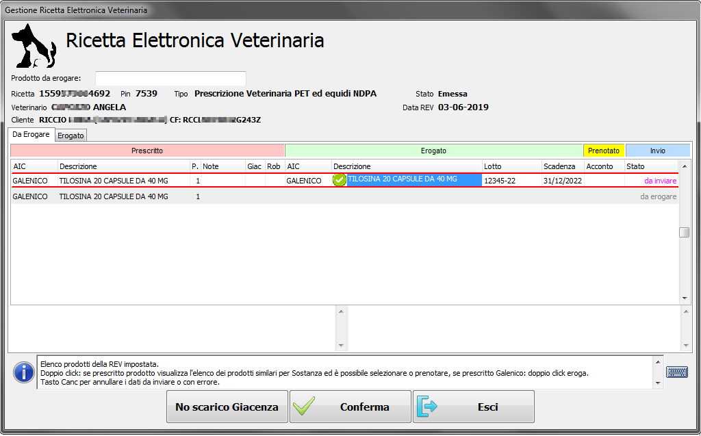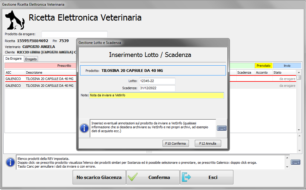 Se il prodotto veterinario è presente nel robot, puoi richiamarlo manualmente e poi procedere con l’erogazione della REV oppure se per quel prodotto hai a disposizione la bolla del Grossista puoi inserire i codici per richiamare a gestionale la ricetta, quindi di seguito inserisci l’AIC del prodotto nel campo inserimento e procedi con l’inserimento di lotto e scadenza, infine premi il tasto per riportare come di consueto il prodotto in vendita.