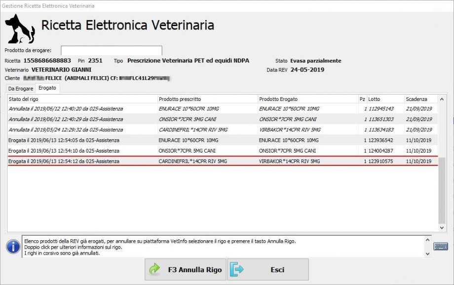 - Se vuoi annullare la vendita precedente e quindi cambiare prodotto, dopo aver richiamato la ricetta Evasa parzialmente, prima seleziona la pagina Erogato (qui è presente lo storico delle erogazioni e degli annulli effettuati; per visualizzare ulteriori dettagli fai doppio click sul rigo di tuo interesse) e poi scegli il prodotto da eliminare selezionando il rigo in cui è riportato, quindi premi il tasto ed attendi l’elaborazione dei dati per la richiesta di annullo sul portale ministeriale di Farmacosorveglianza. Ad operazione ultimata ritroverai il prodotto che hai annullato nella pagina Da Erogare e pertanto potrai procedere con una nuova erogazione.