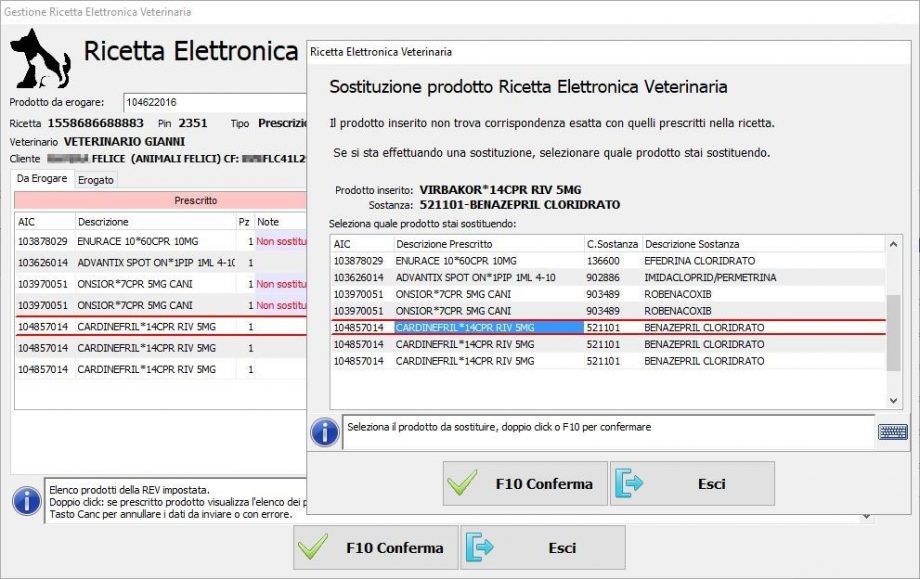 - Se il prodotto è sostituibile puoi fare doppio click sul farmaco prescritto al fine di visualizzare un elenco di equivalenti per sostanza eventualmente da scegliere e dispensare (ATTENZIONE: avente stessa forma farmaceutica e medesima composizione quali-quantitativa) confermando poi la volontà di sostituire con .