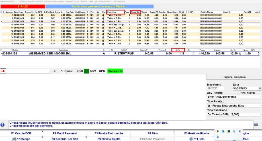 Gestione ricette elettroniche > in questo contesto (raggiungibile dalla vendita usando i tasti funzione / / ) impostare mese e anno da controllare e avviare la ricerca della ricetta per NRE oppure per num. progressivo. Fatto ciò verificare le colonne riepilogative per confrontare i valori della ricetta.