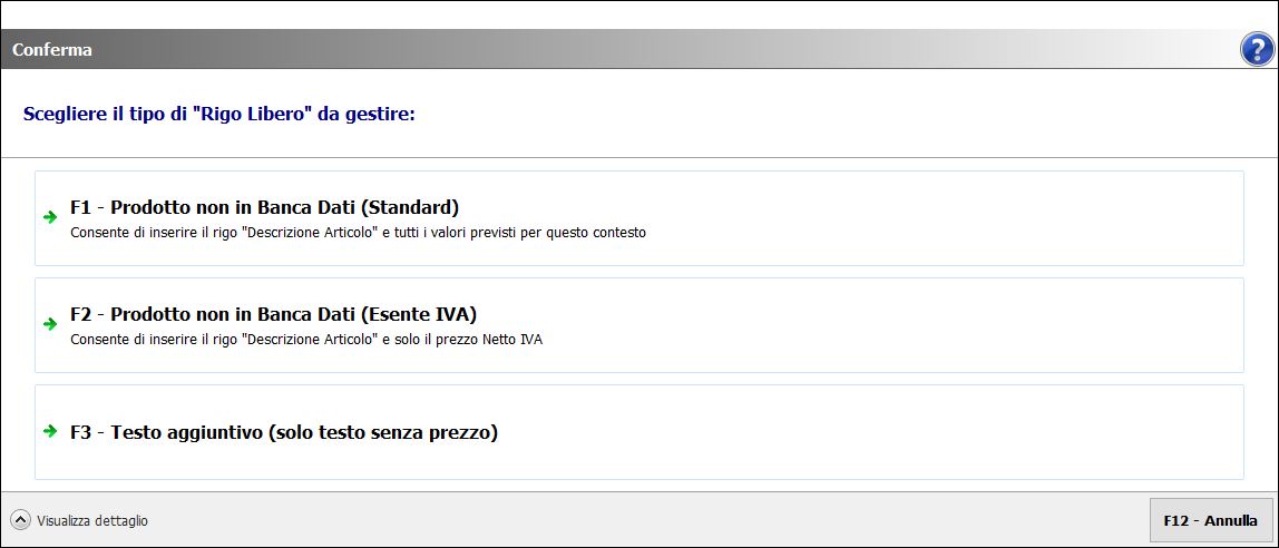 5. Premi F1 Rigo/Testo Libero se hai necessità di inserire una descrizione del prodotto perché fuori archivio. Inserimento rigo libero Documenti di vendita