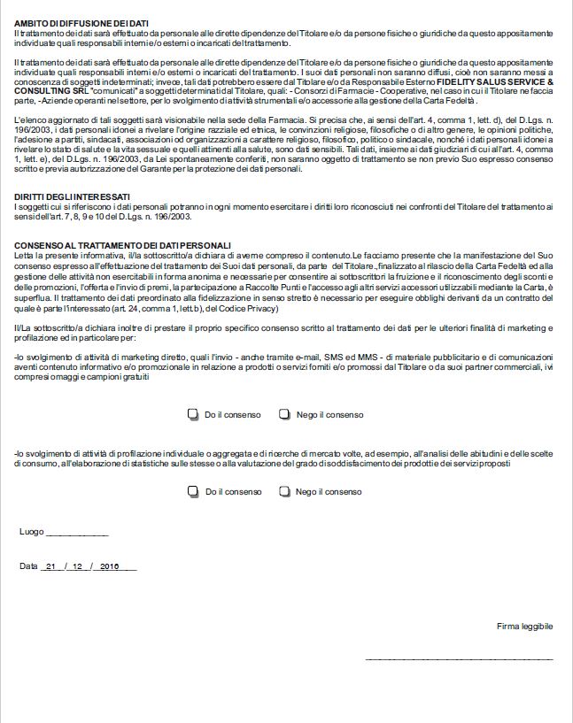 - Al termine della compilazione delle schede premi . Attendi quindi l’eleborazione dei dati su piattaforma web del circuito FidelitySALUS al fine di ottenere la registrazione del cliente e la creazione del file pdf per la consegna card e autorizzazione all’uso dei dati rilasciati (modulo privacy).