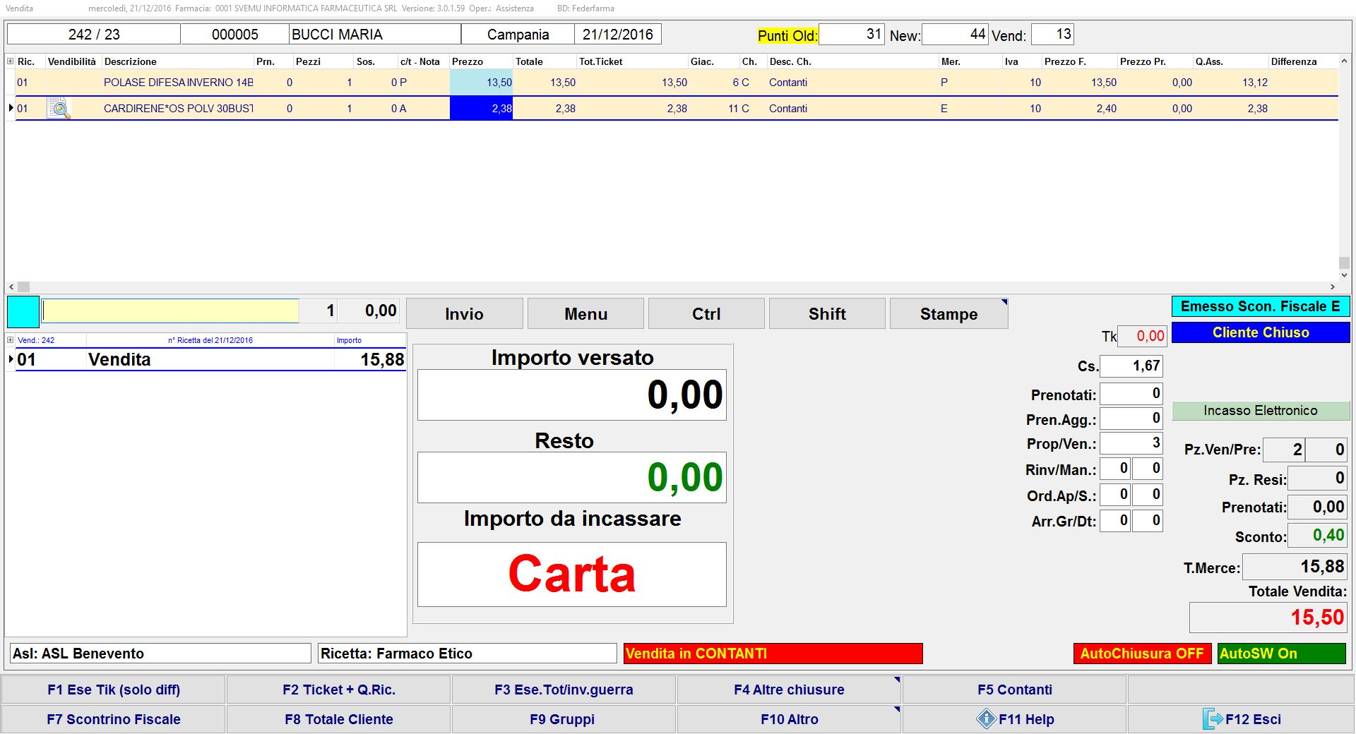 - Inserisci come di consueto il/i prodotto/i (ovviamente per ottenere punti dev’essere acquistato un prodotto che ne attribuisce – tra quelli individuati dal Network) in vendita e poi chiudi la vendita con (se richiesto digita o seleziona il Codice fiscale dall’elenco e conferma con ), oppure con per emettere lo “Scontrino non Fiscale”. A vendita chiusa visualizzerai la seguente schermata di riepilogo con indicato anche il saldo punti del circuito FidelitySALUS aggiornato.