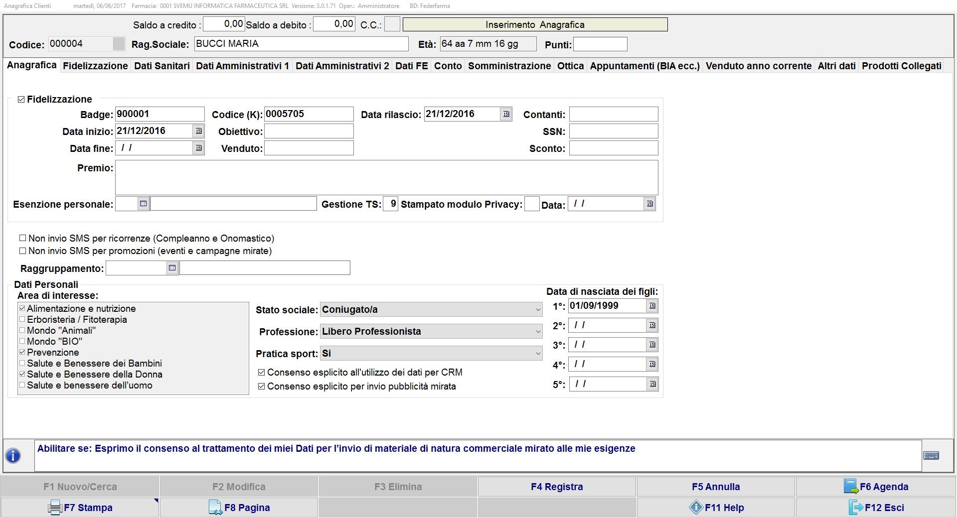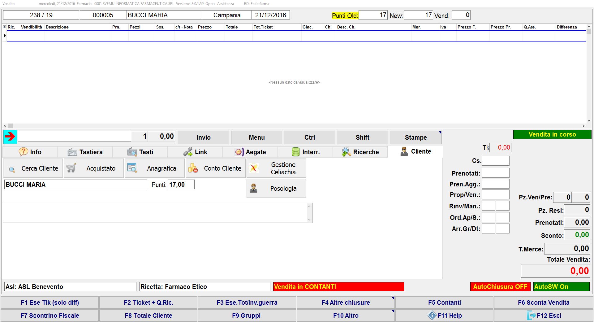 - Con l’ausilio del lettore ottico inserisci il barcode della tessera del cliente, visualizzerai la seguente schermata di vendita che riporta i dati del cliente in questione precedentemente fidelizzato: