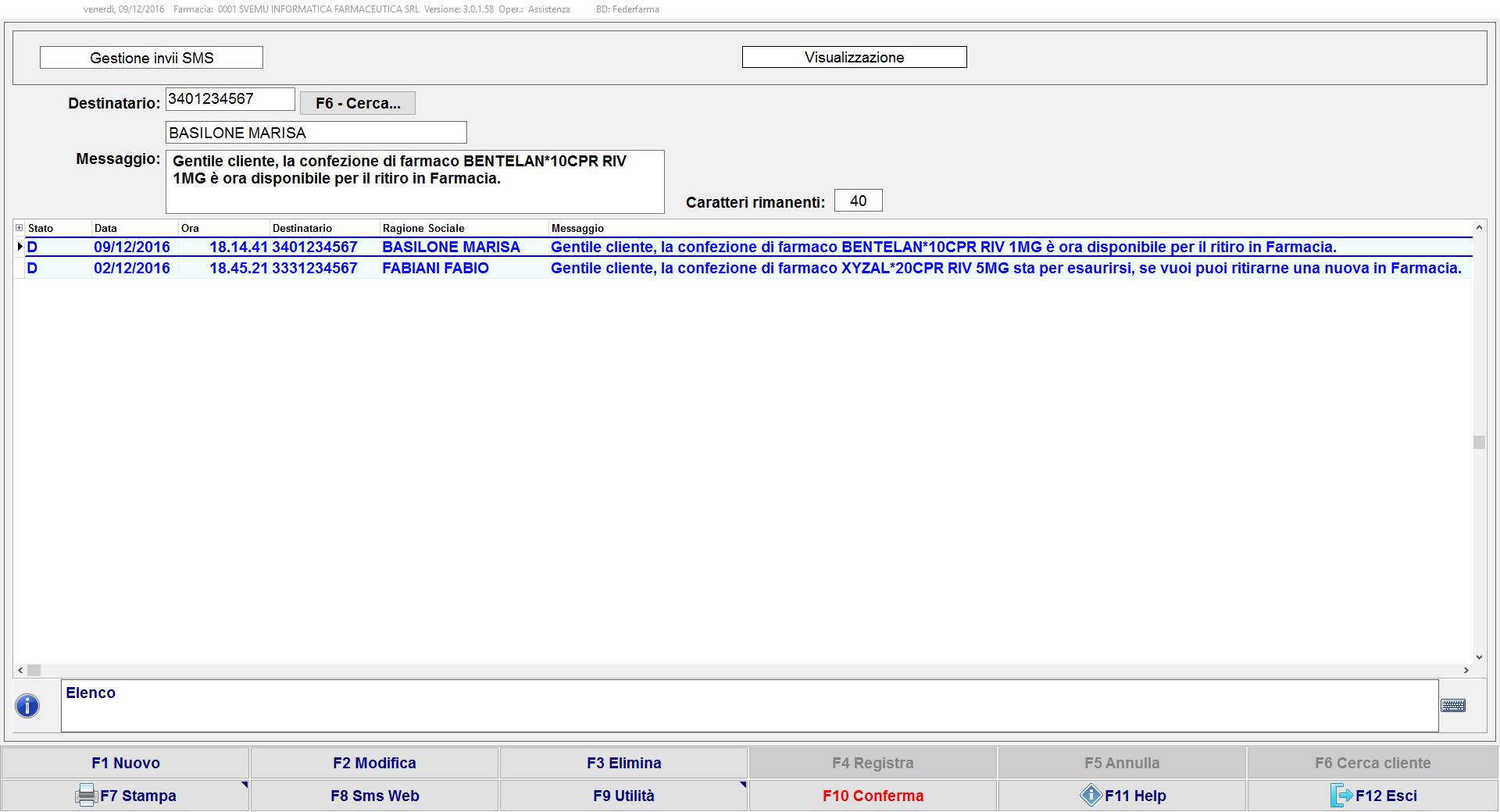 Servizio a pagamento, attivabile su richiesta, già implementato nel gestionale che permette d’inviare messaggi sms (promozionali, di auguri, di ritiro prodotto prenotato ecc.) ai clienti della Farmacia registrati nell’Anagrafica clienti.
