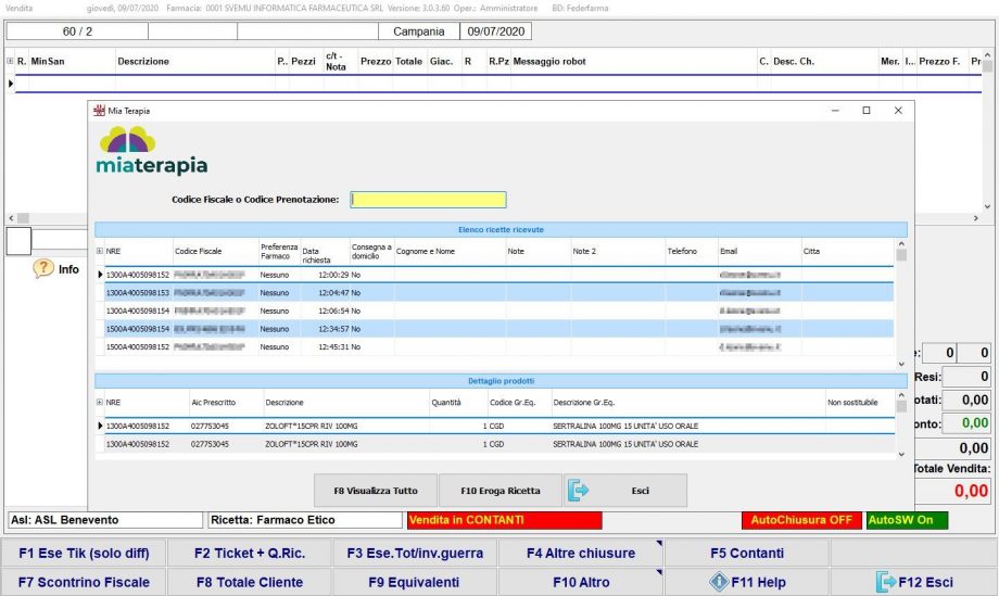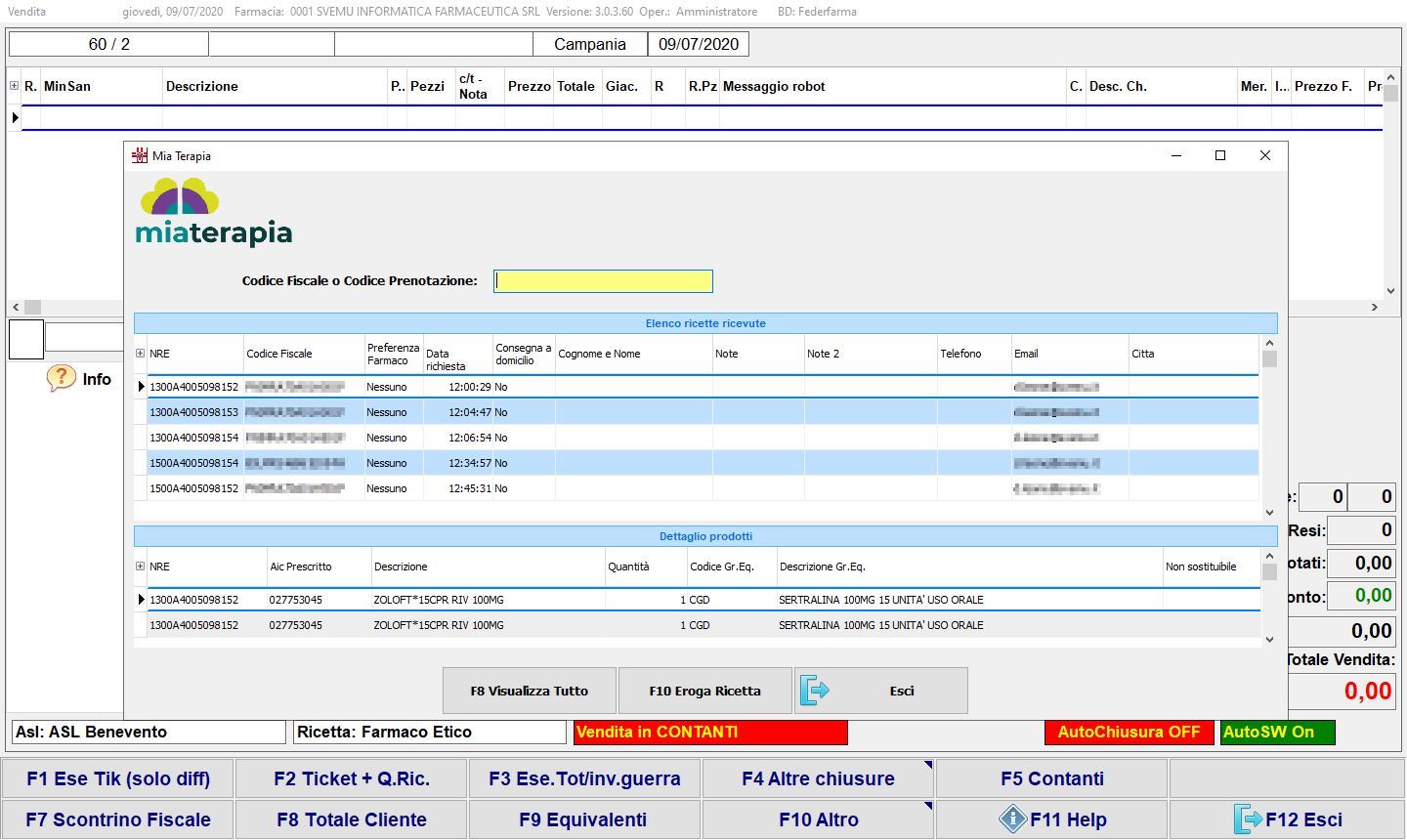 Quando visualizzerai la presenza di ricette sul gestionale, premi il tasto Miaterapia e procedi con l’erogazione dei prodotti: