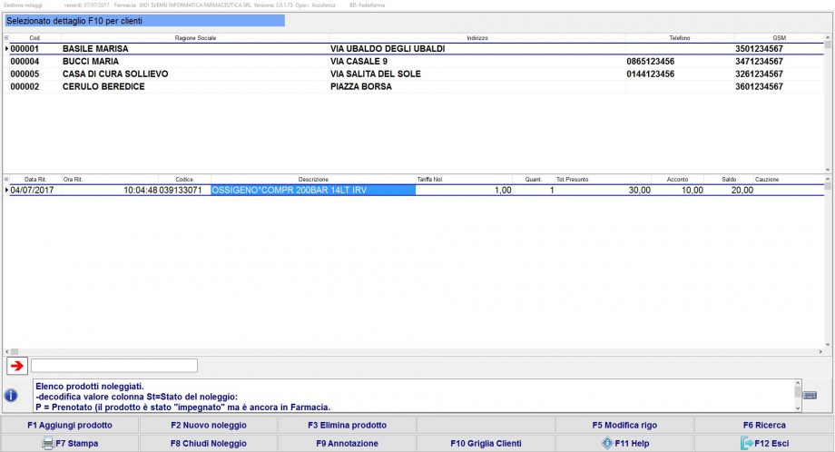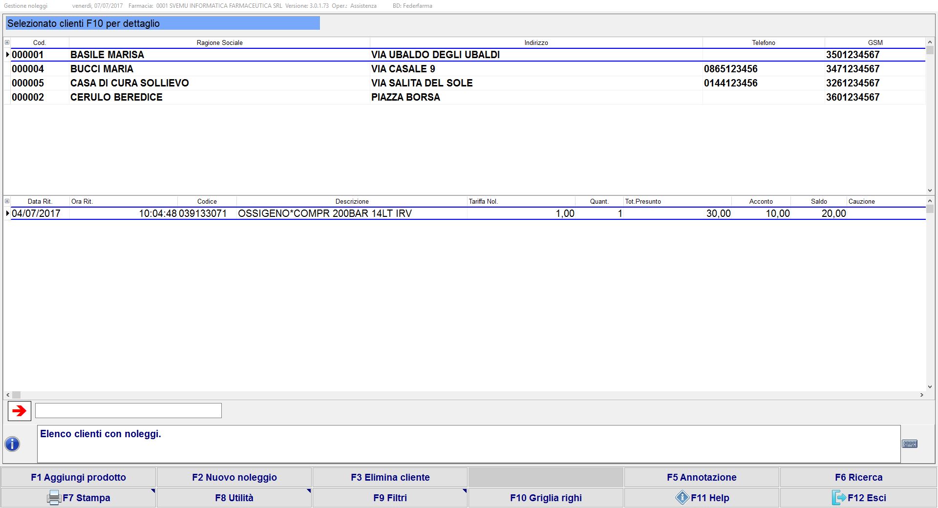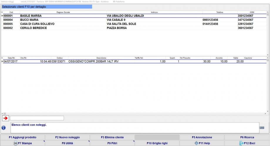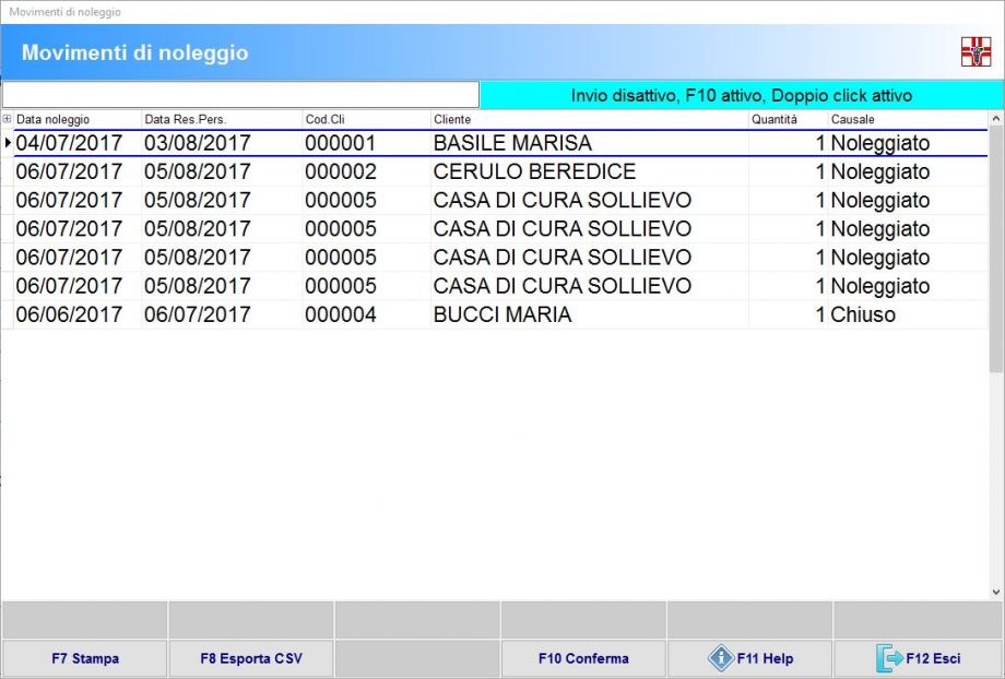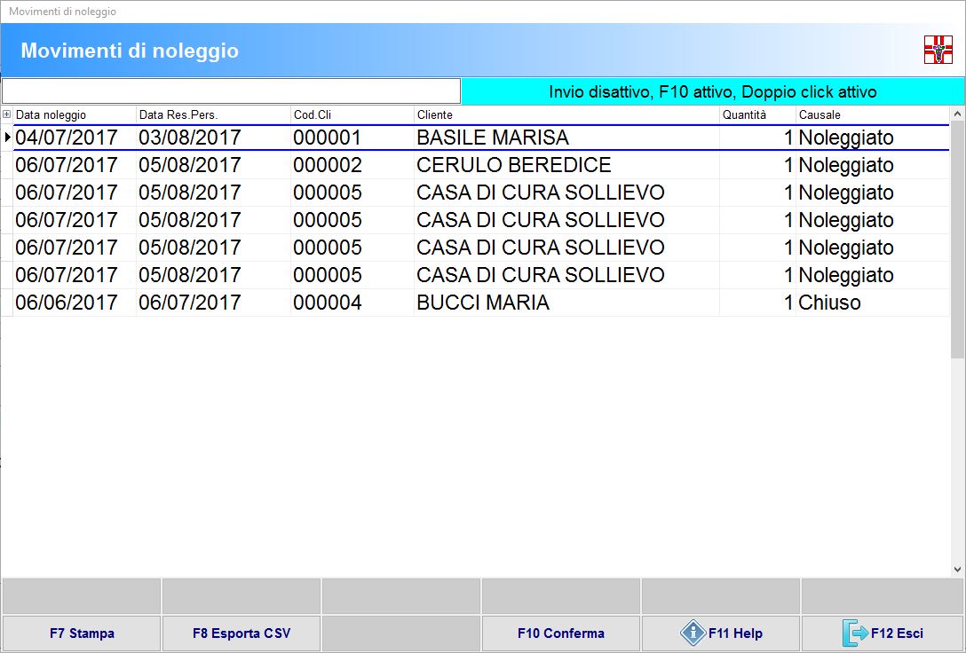 - Seleziona il cliente oppure ricercalo digitando le iniziali, quindi seleziona il rigo di tuo interesse (visualizzerai il dettaglio di quanto noleggiato) e premi se per quel cliente vuoi inserire un nuovo prodotto da noleggiare, oppure premi se vuoi creare un noleggio per un nuovo cliente, o ancora premi se intendi eliminare definitivamente il cliente ed i relativi prodotti da lui noleggiati fino ad oggi; premi se hai necessità di aggiungere un’annotazione al noleggio che non hai inserito in fase di creazione/chiusura; premi per stampare un report del/dei noleggi creati a seconda del tipo di analisi che intendi effettuare; premi e poi qualora tu non voglia tenerli in memoria; premi per filtrare appunto l’elenco dei noleggi a seconda delle tue esigenze di valutazione; premi F10 Griglia righi se vuoi passare nei campi sottostanti, ovvero quelli relativi ai prodotti noleggiati dal paziente selezionato.