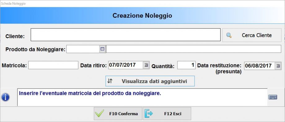 - Dopo aver compilato la Scheda Noleggio e gli eventuali dati aggiuntivi, premi F10 Conferma per salvare il noleggio e per stampare il riepilogo di apertura noleggio.