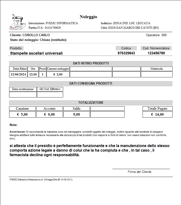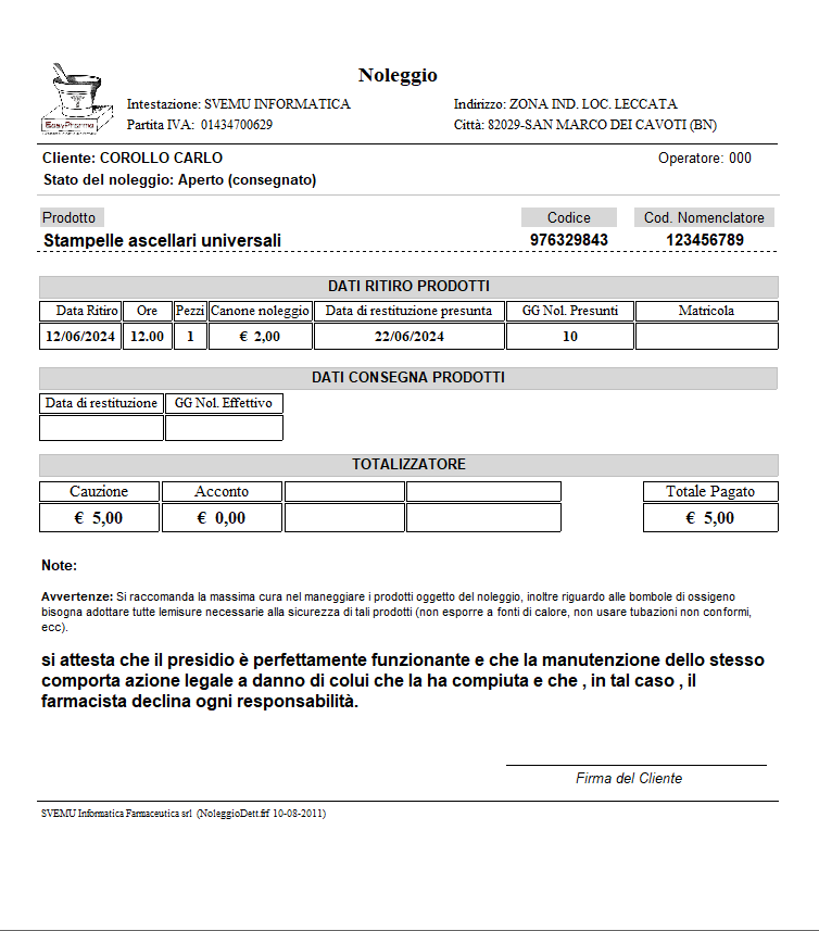- Fatto ciò in automatico il noleggio verrà registrato come chiuso/restituito e potrai procedere con la stampa di riepilogo da conservare come prova a cura del Farmacista (eventualmente effettuare una stampa in duplice copia per consegnarne una anche al cliente).