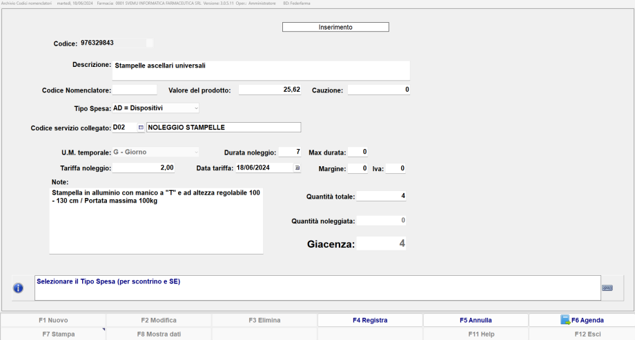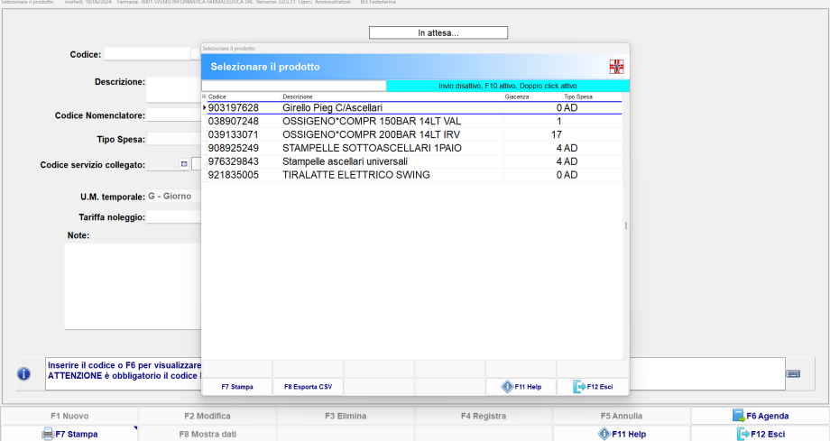 - Se vuoi visualizzare i prodotti noleggiabili in Farmacia, o apportare modifiche ad uno o più di questi, oppure eliminarlo definitivamente premi prima per aprire l’elenco e scegliere poi, facendo doppio click col mouse, quello di tuo interesse e poi uno dei tasti funzione inerenti.