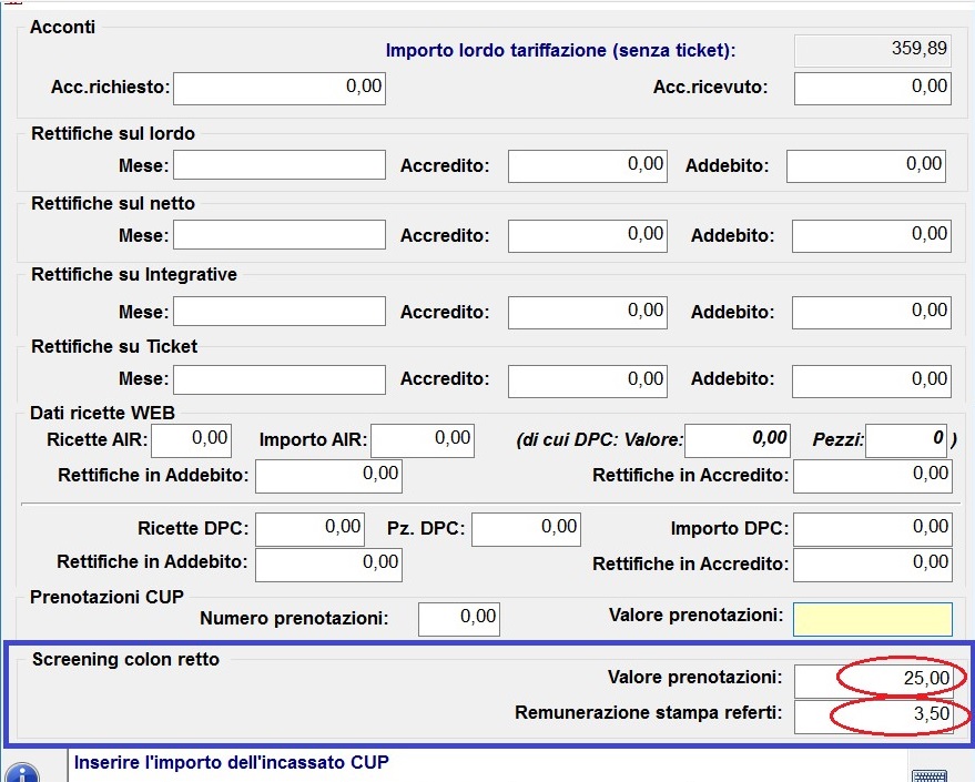 Nel gestionale sono stati implementati i righi 15, 15a e 15b della DCR, deputato al CUP, al fine di poter effettuare la somma algebrica della remunerazione dovuta alle Farmacie per lo Screening del colon retto (per ogni campione consegnato € 2,00).