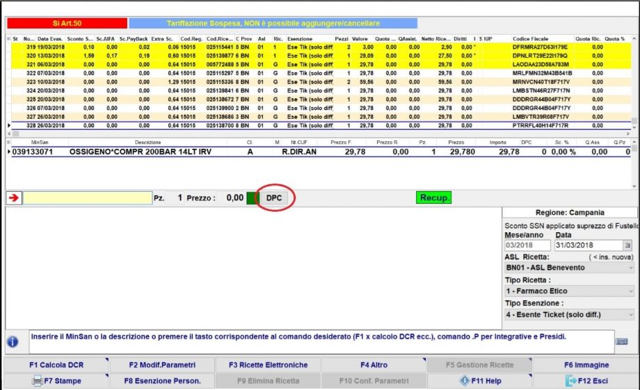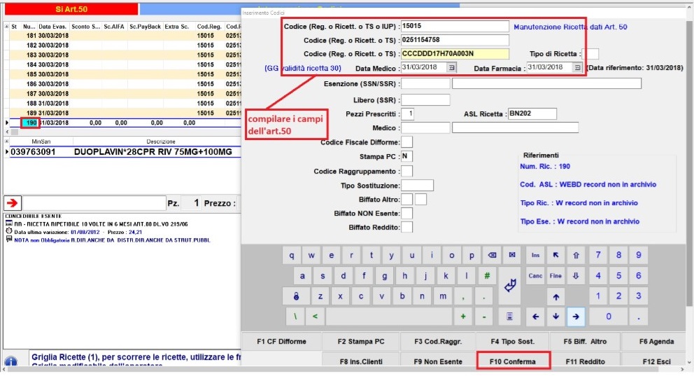 - In fase di chiusura della ricetta, comparirà la maschera dell’Art.50, quindi compila inserendo i dati necessari per l’art.50 (cod ricetta, cod. ricettario, CF, data Medico e data spedizione):