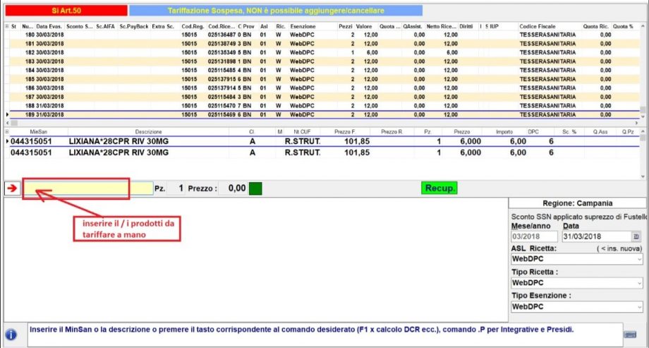 - Inserisci/tariffa solo le ricette da “tariffare a mano” – non è necessario impostare il tipo ricette e neppure il tipo esenzione – :