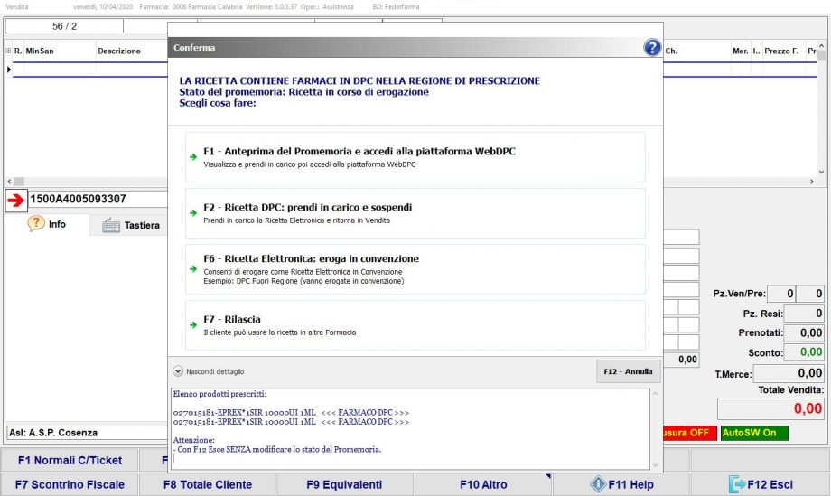 2. Premi F1 – Anteprima del Promemoria e accedi alla piattaforma WebDPC se hai ricevuto solo i codici e hai necessità di stampare il promemoria, nonché accedere alla piattaforma web (WebDPC/GOpenDPC) e sospendere la ricetta su Sogei e/o SAR.