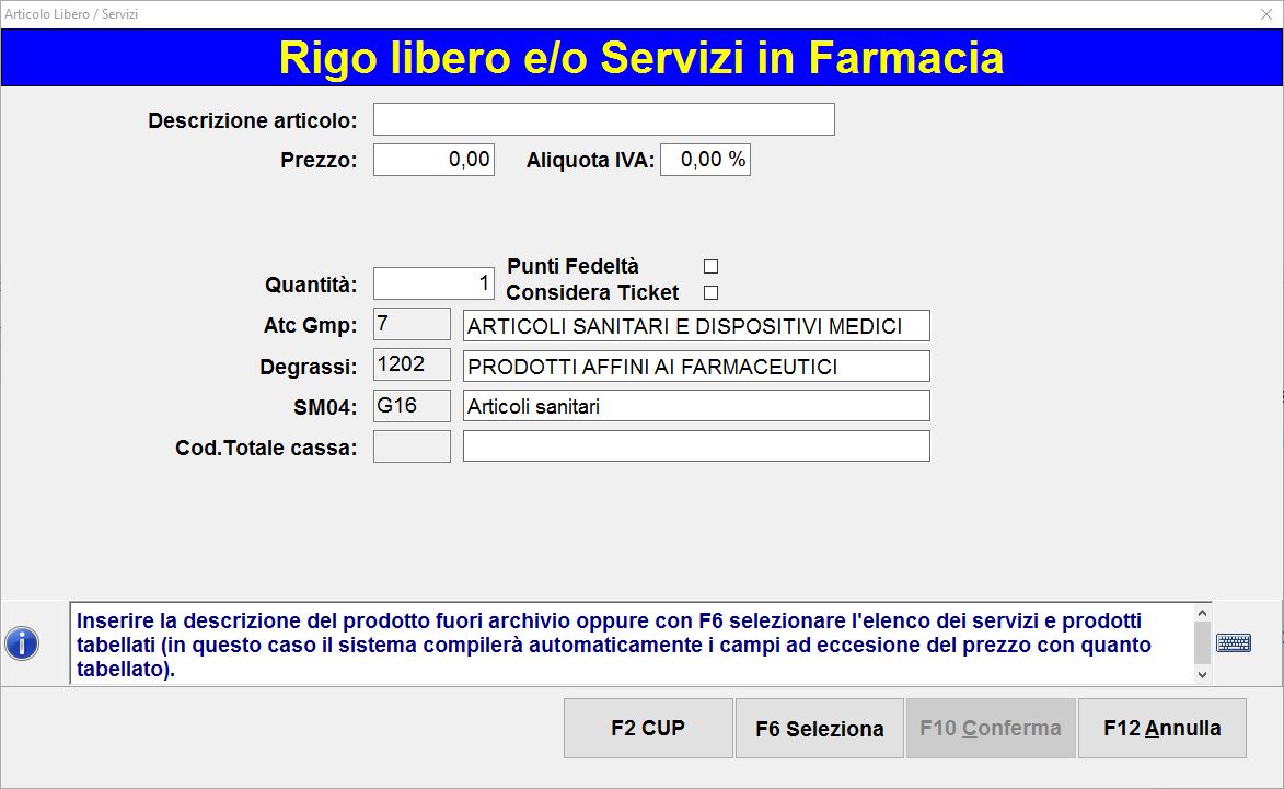 Funzione operativa che permette di inserire nel gestionale prodotti e/o servizi venduti in farmacia che non sono presenti in Banca dati professionale, definendone la tipologia ed il prezzo praticato per ciascuno di essi.