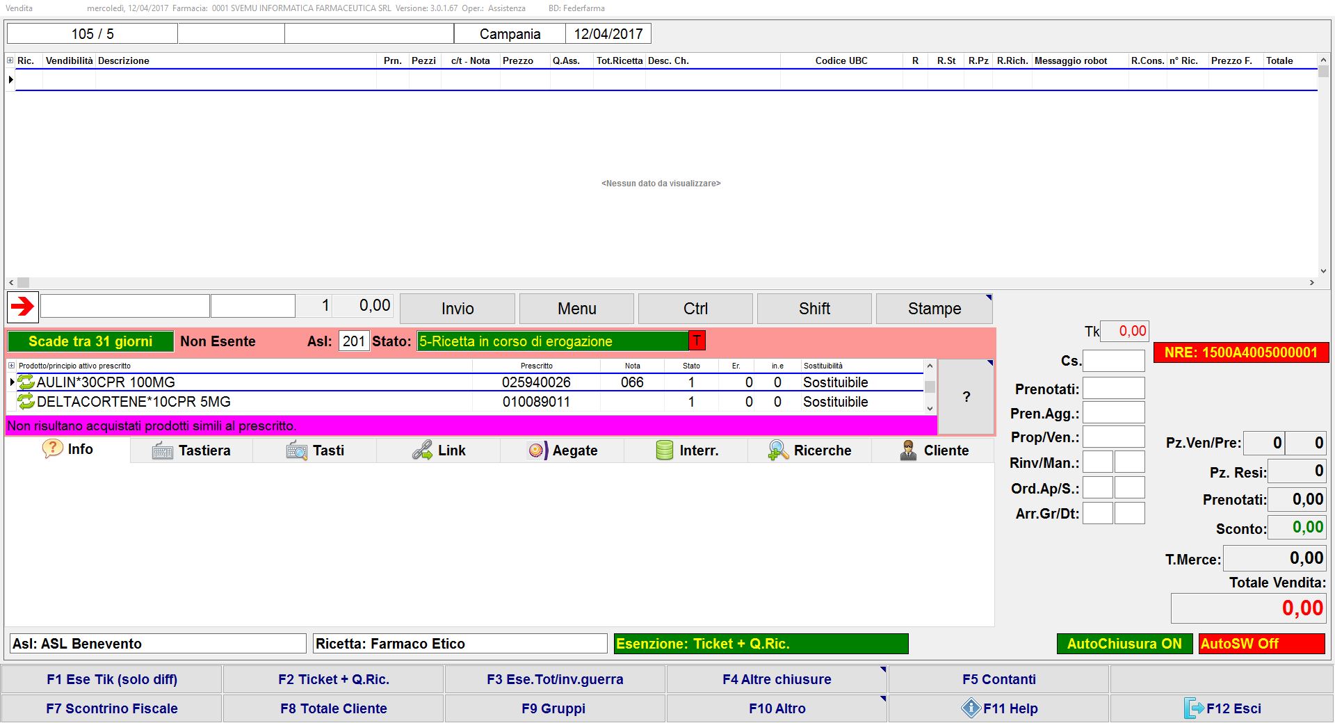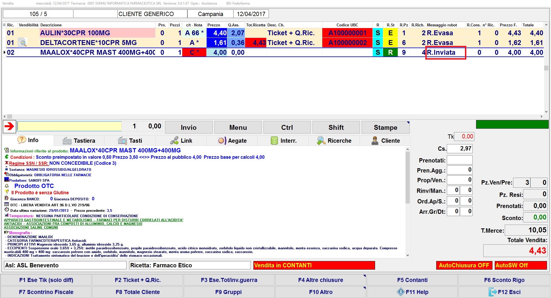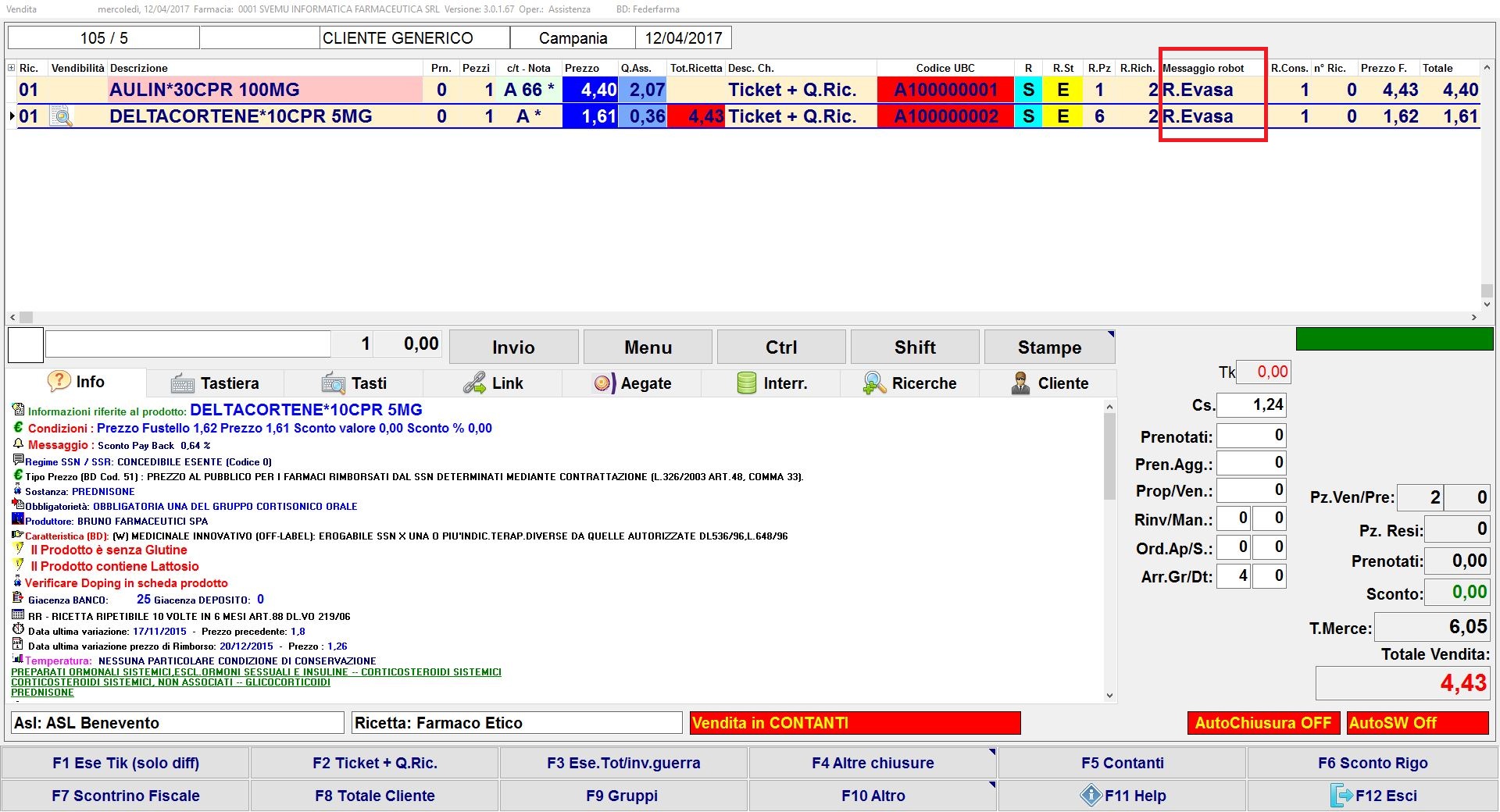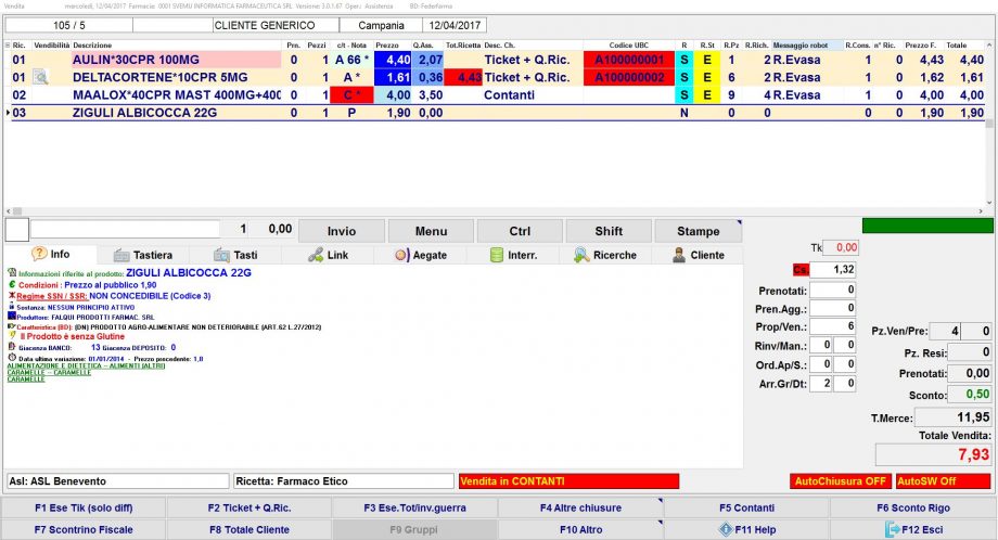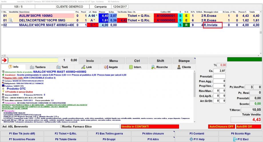 • Se in questa vendita vuoi aggiungere altri prodotti (ulteriore ricetta SSN elettronica, ricetta SSN rossa, farmaci di fascia C, parafarmaci, ecc.) se necessario, imposta prima l’esenzione (ricetta SSN rossa) o premi F5 Contanti, e per richiedere poi i prodotti al robot premi freccia dx dalla tastiera. Nel caso di nuova R.E. ripeti i passaggi appena eseguiti.