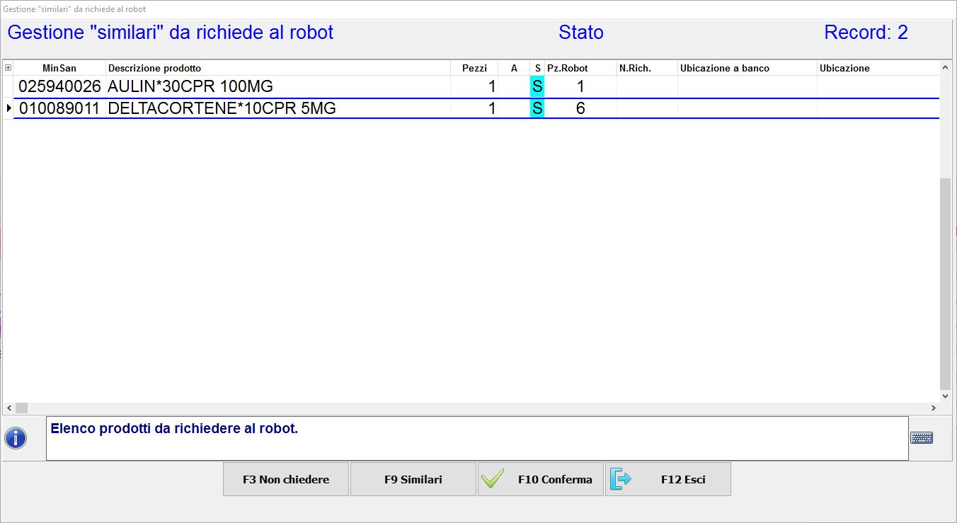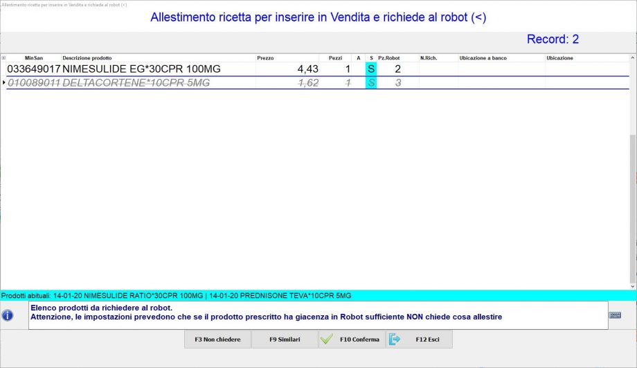• Se della ricetta devi erogare UN solo pezzo col robot seleziona il rigo recante il prodotto in questione se hai facoltà di scegliere un similare e premi F9 Similari, altrimenti quel prodotto lascialo invariato mentre per l’altro presente in ricetta (da non richiedere al robot) premi F3 Non chiedere per escluderlo e inserirlo successivamente in vendita manualmente.