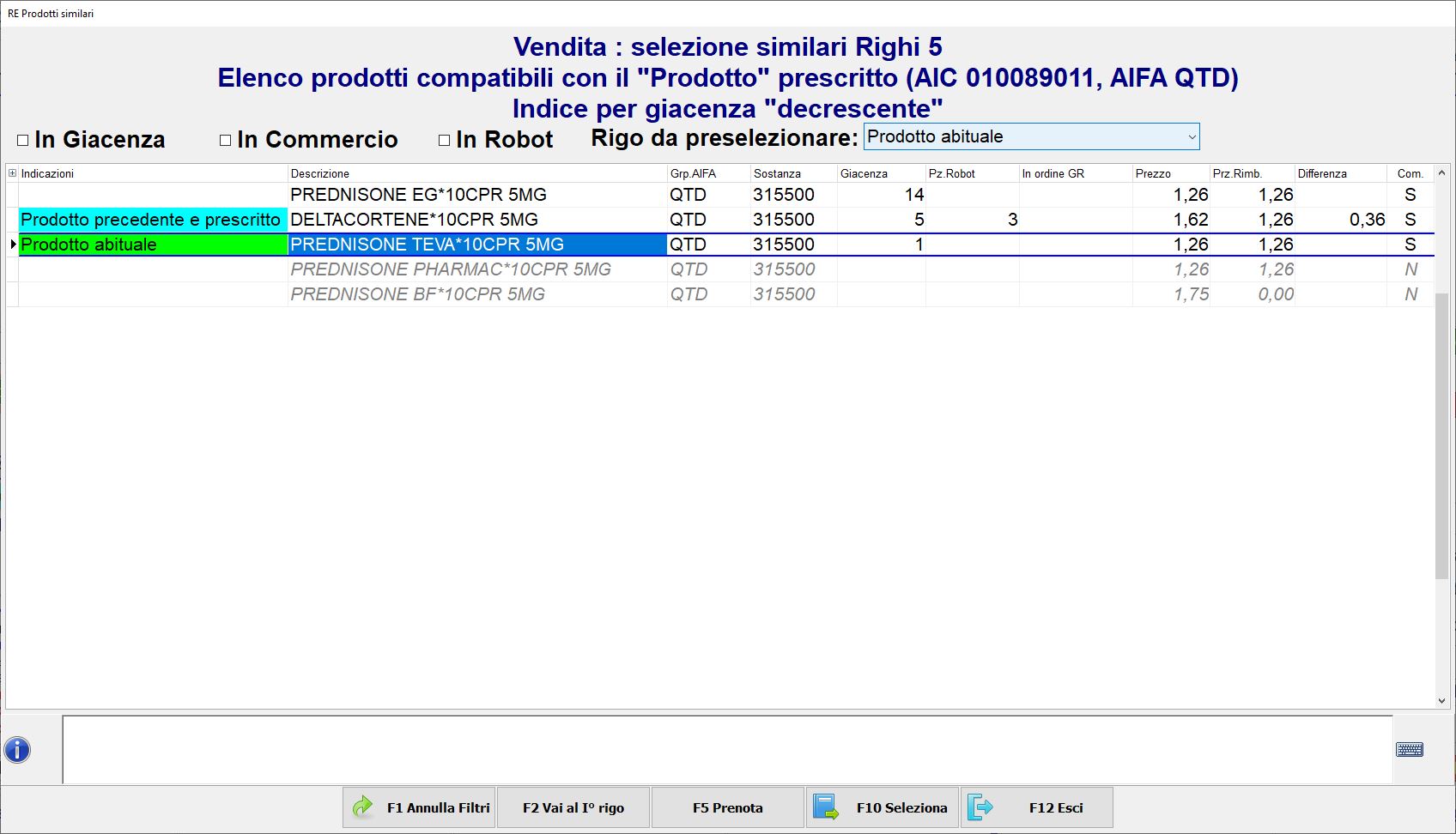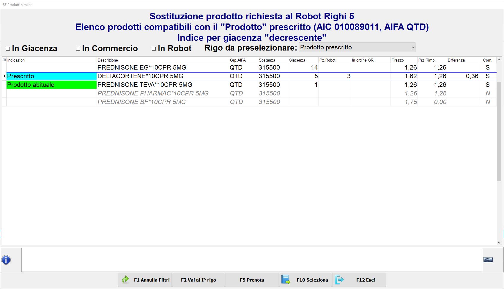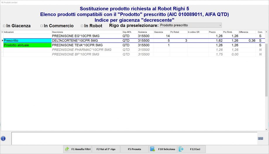 • Se la ricetta ha come prescritto 2 o più farmaci aventi lo stesso principio attivo e tu devi dispensare un similare poiché la giacenza per il prescritto nel Robot è pari a zero, seleziona quello con giacenza positiva da chiamare a Robot e poi premi F10 Seleziona. Questa scelta resterà impostata anche per il richiamo del/dei pezzo/i successivo/i, pertanto basterà premere nuovamente F10 Seleziona.