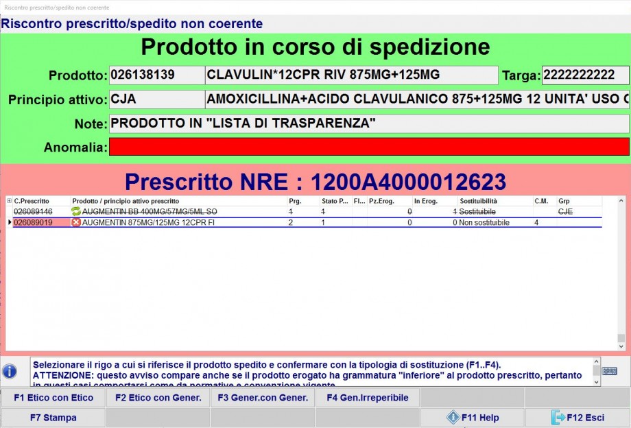 N.B. Qualora tenterai di spedire un prodotto diverso da quello prescritto (anche relativamente alla sola unità posologica), visualizzerai un avviso che se ignorato genererà un ERRORE che non renderà più possibile la spedizione su Sogei.
