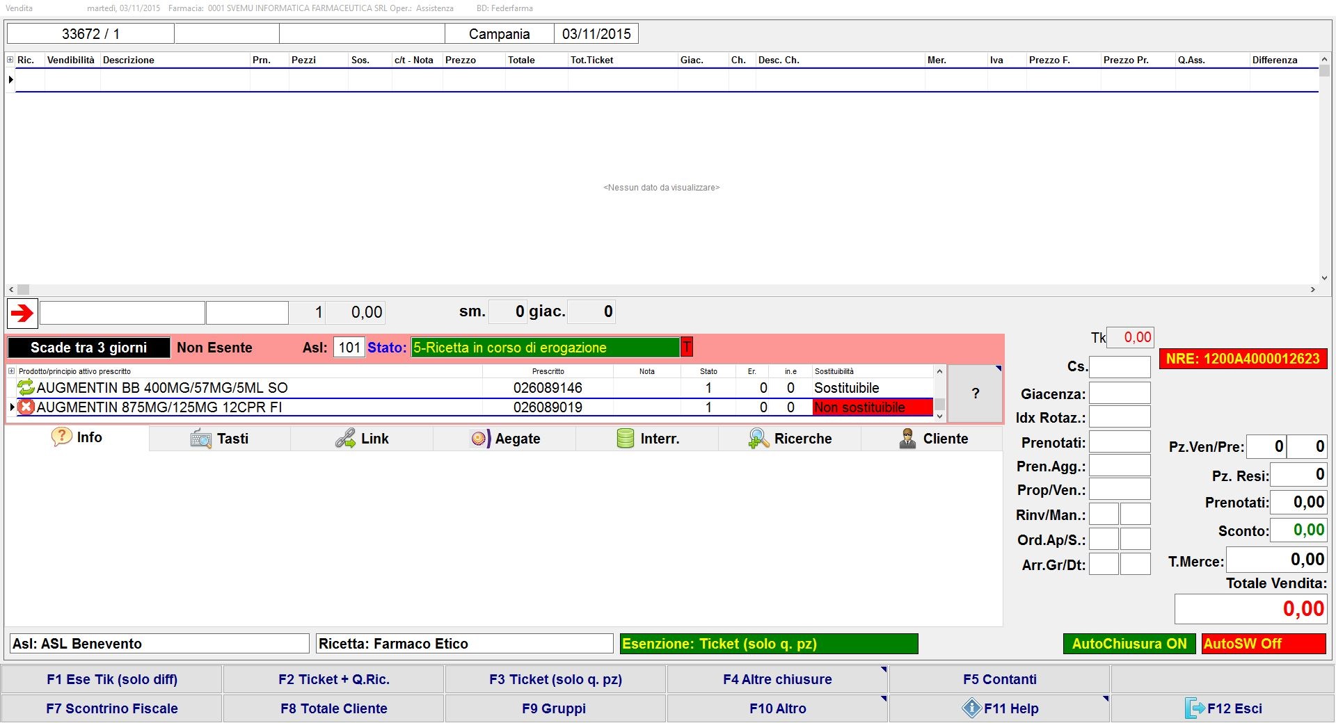 - Se hai impostato il riconoscimento automatico della ricetta (Autoswitch) saranno rilevati automaticamente sia l’esenzione o il Ticket sia il tipo di chiusura.